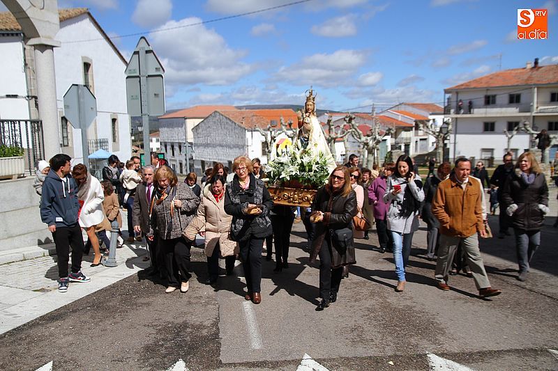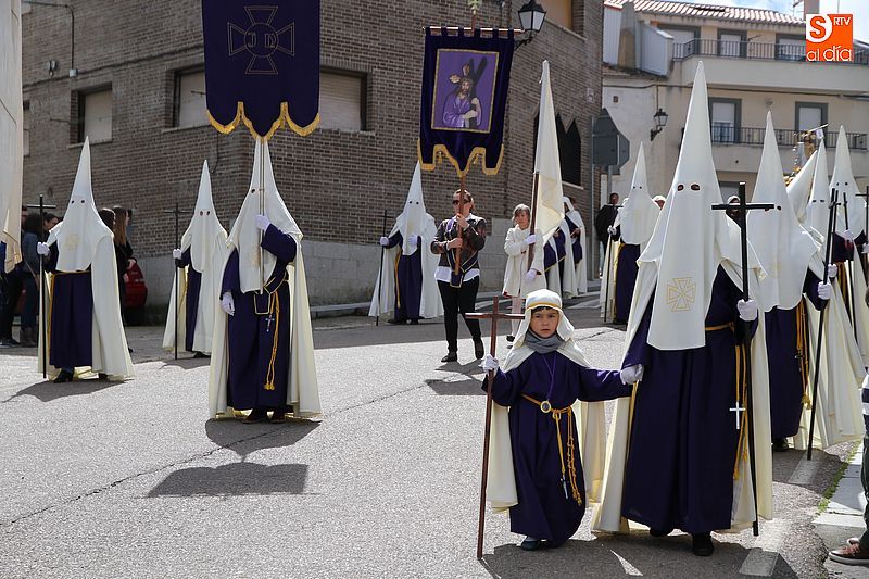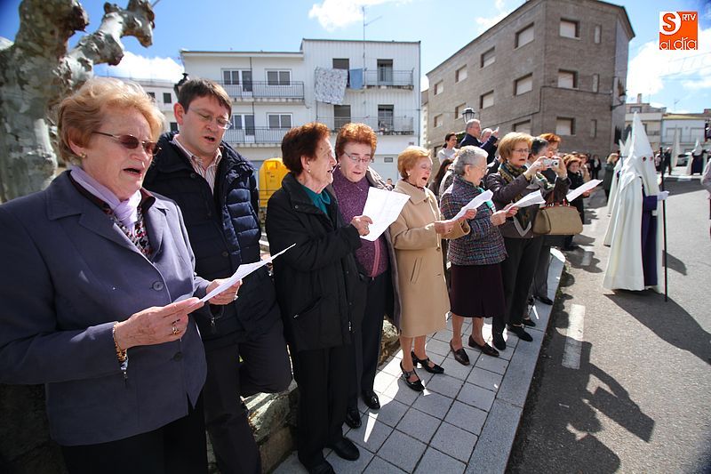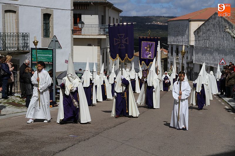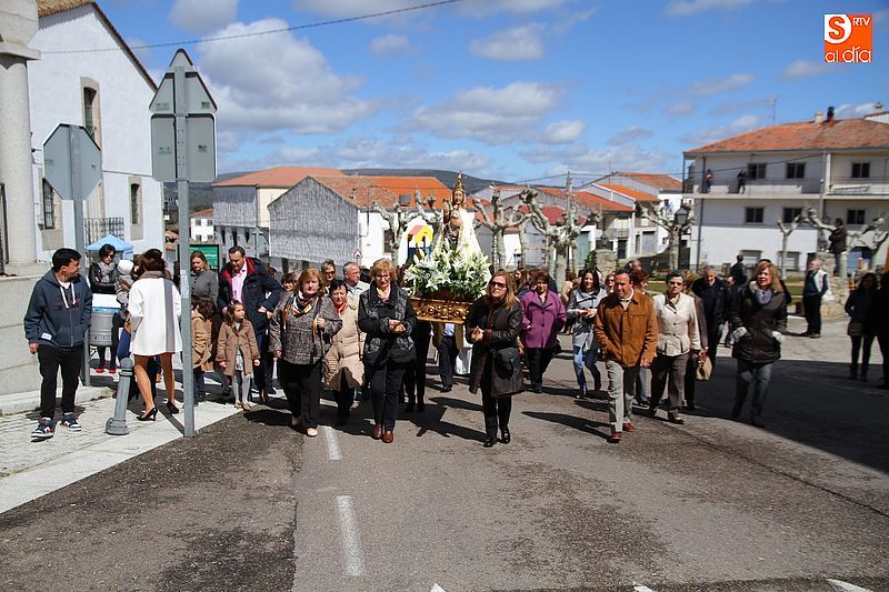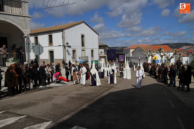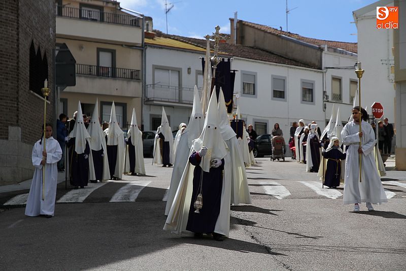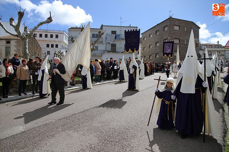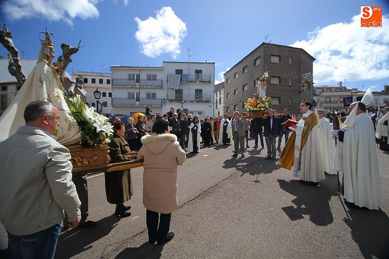 Los fieles de Ledrada disfrutaron hoy del último de los actos litúrgicos con la tradicional Procesión del Encuentro. La Cofradía de Jesús El Nazareno partió de la iglesia portando la imagen de Cristo al encuentro del paso de la Virgen que esperaba enfrente del edificio Consistorial. La mayor novedad del acto fue la imagen de Cristo Resucitado, recientemente donada de manera anónima a la parroquia. En el momento del encuentro de ambas imágenes, el coro parroquial interpretó un himno y el párroco cumplió con el rito de la incesación. Una vez finalizado el encuentro, los cofrades marcharon a buen ritmo, marcado por los tambores hasta la iglesia donde se ofició la Santa Misa.
