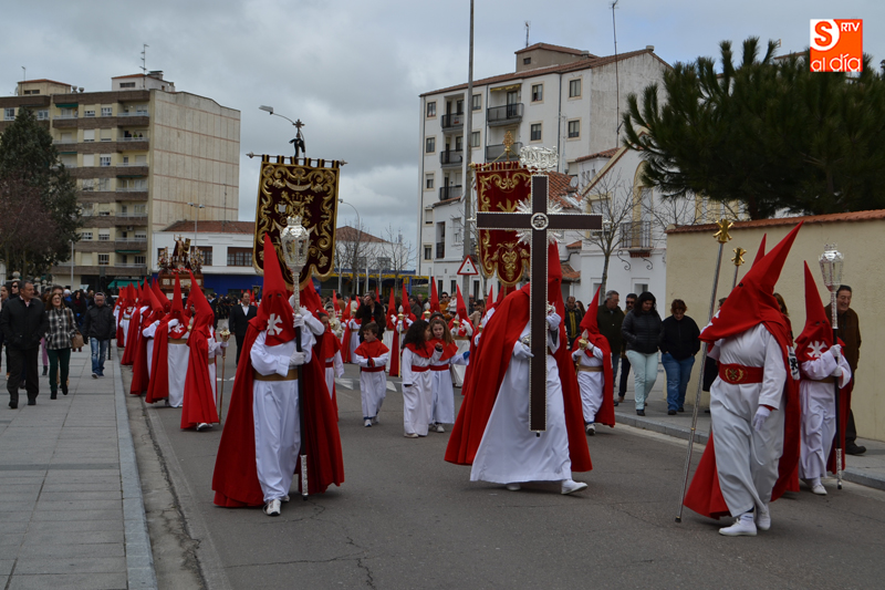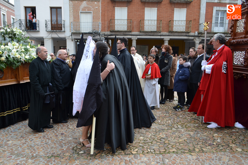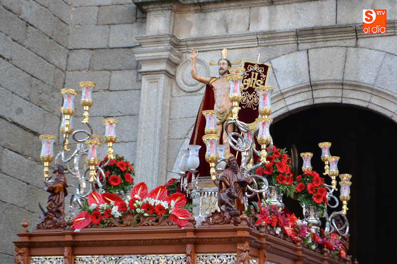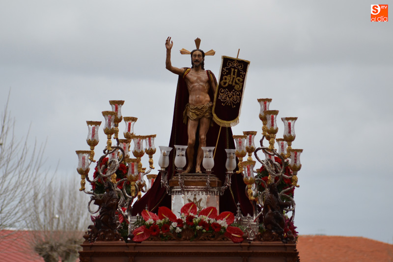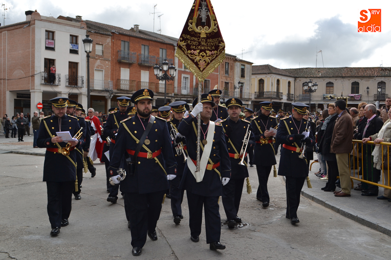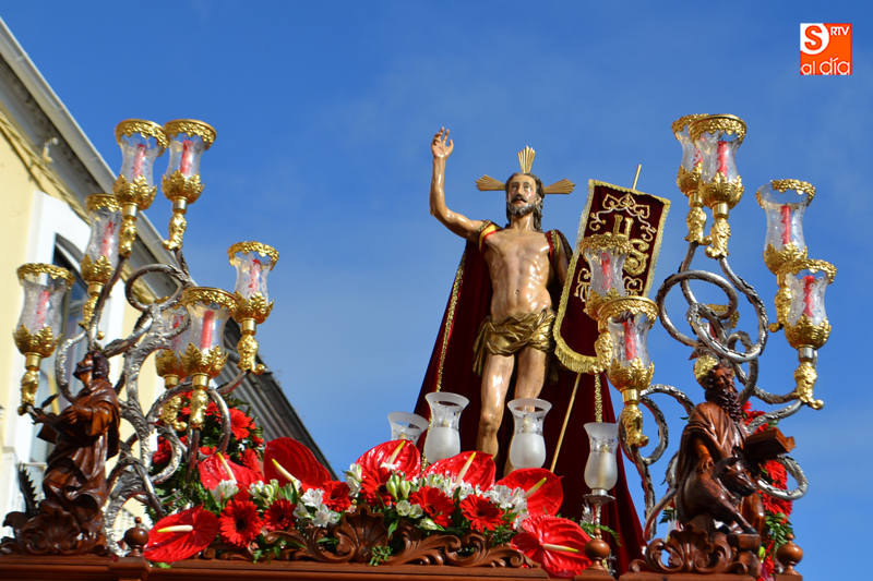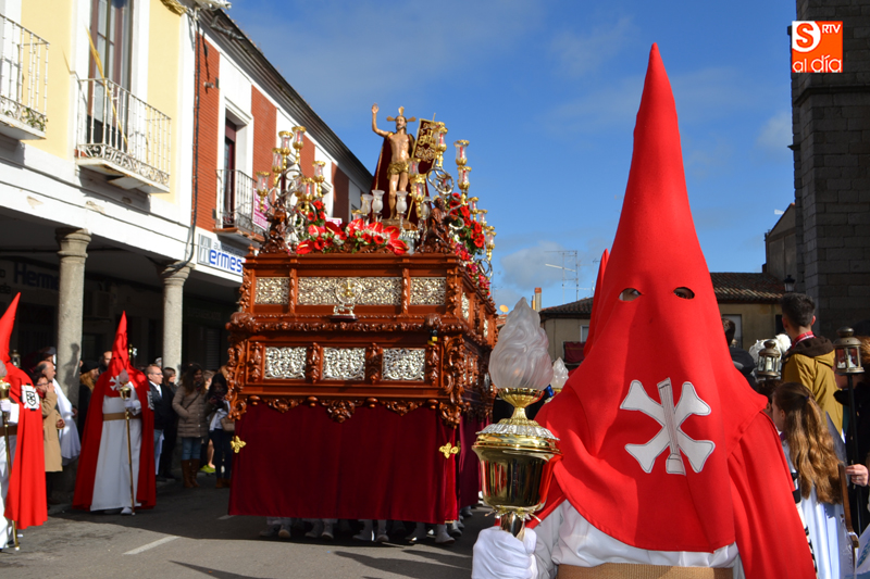 La comitiva partía pasadas las diez y media de la mañana desde la iglesia parroquial, desde la que Jesús Resucitado comenzaba su peregrinar, engalanado sobre su nuevo trono que era cargado por 35 costaleros llegados desde la capital charra. Tras un breve recorrido por las calles de la ciudad llegaban a la Plaza Nueva, para posteriormente encaminarse hacia la Plaza de la Constitución donde tuvo lugar el encuentro. Un recorrido que estuvo arropado por los sones de la Agrupación Musical Cristo Yacente de Salamanca, a la que se sumaba una nutrida representación de cofrades de la Preciosa Sangre, a los que precedían representantes de las cofradías del Santísimo Cristo del Humilladero y del Cristo de la Cama.
