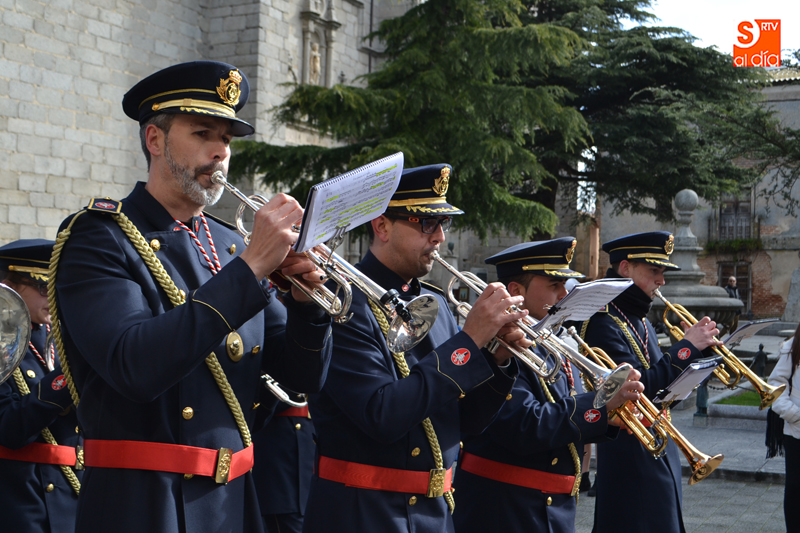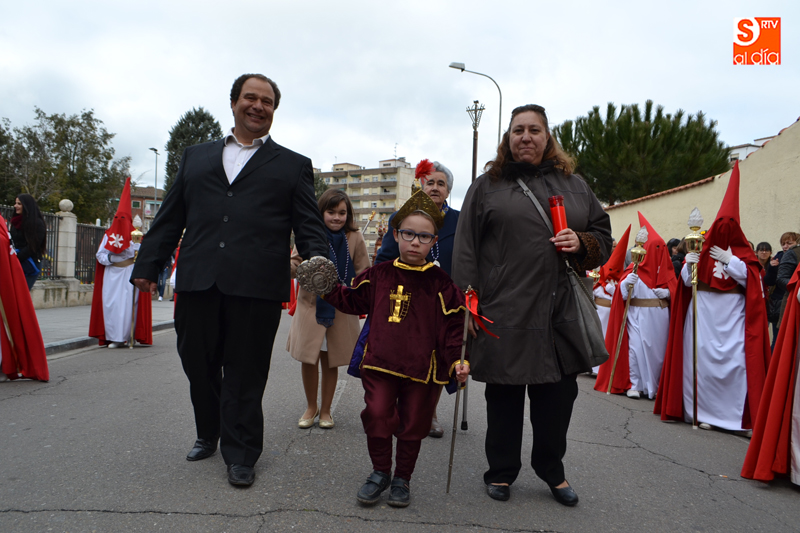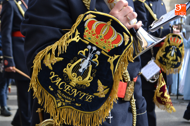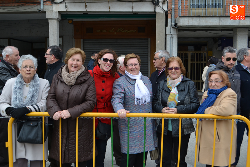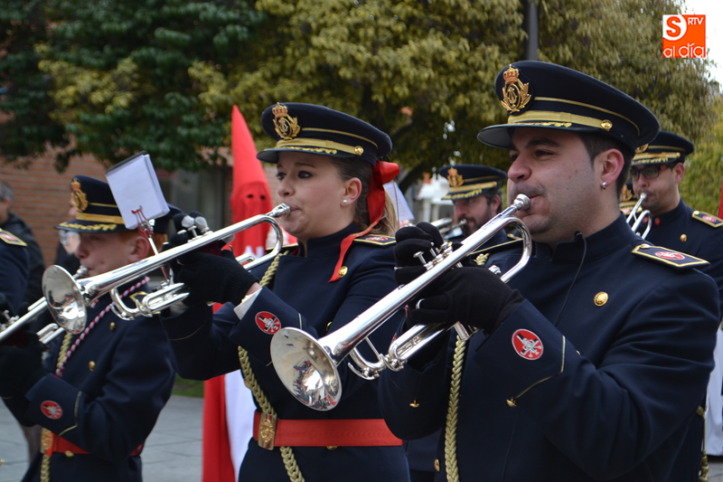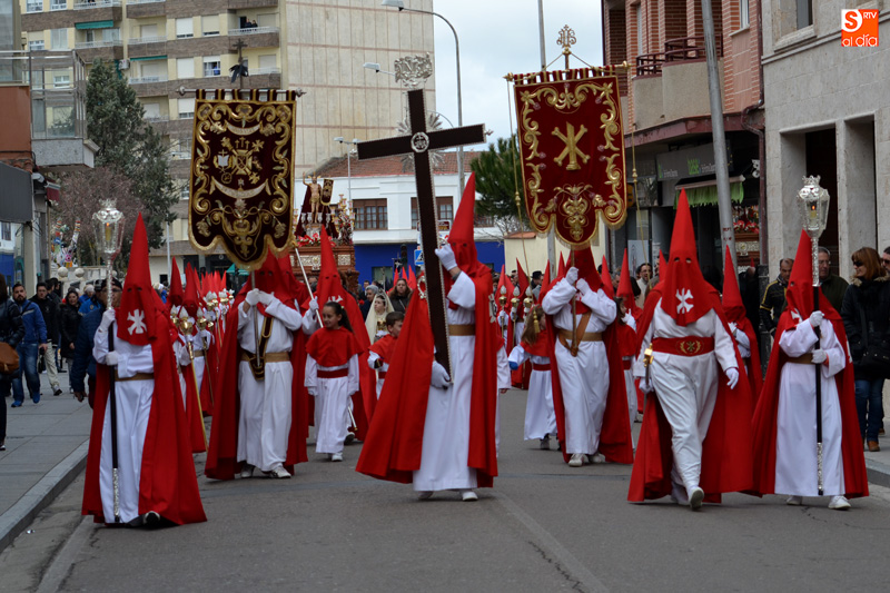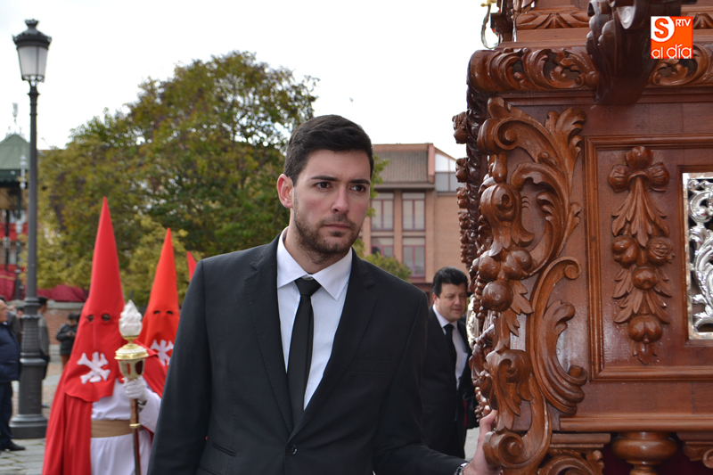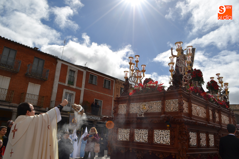 La comitiva partía pasadas las diez y media de la mañana desde la iglesia parroquial, desde la que Jesús Resucitado comenzaba su peregrinar, engalanado sobre su nuevo trono que era cargado por 35 costaleros llegados desde la capital charra. Tras un breve recorrido por las calles de la ciudad llegaban a la Plaza Nueva, para posteriormente encaminarse hacia la Plaza de la Constitución donde tuvo lugar el encuentro. Un recorrido que estuvo arropado por los sones de la Agrupación Musical Cristo Yacente de Salamanca, a la que se sumaba una nutrida representación de cofrades de la Preciosa Sangre, a los que precedían representantes de las cofradías del Santísimo Cristo del Humilladero y del Cristo de la Cama.