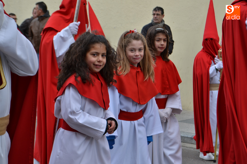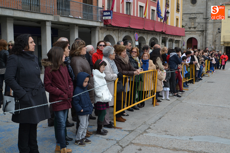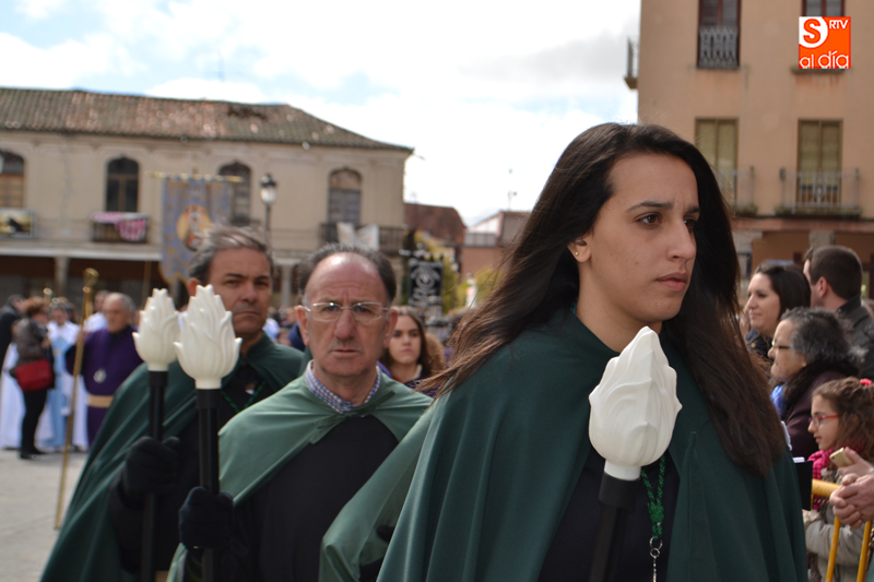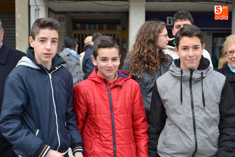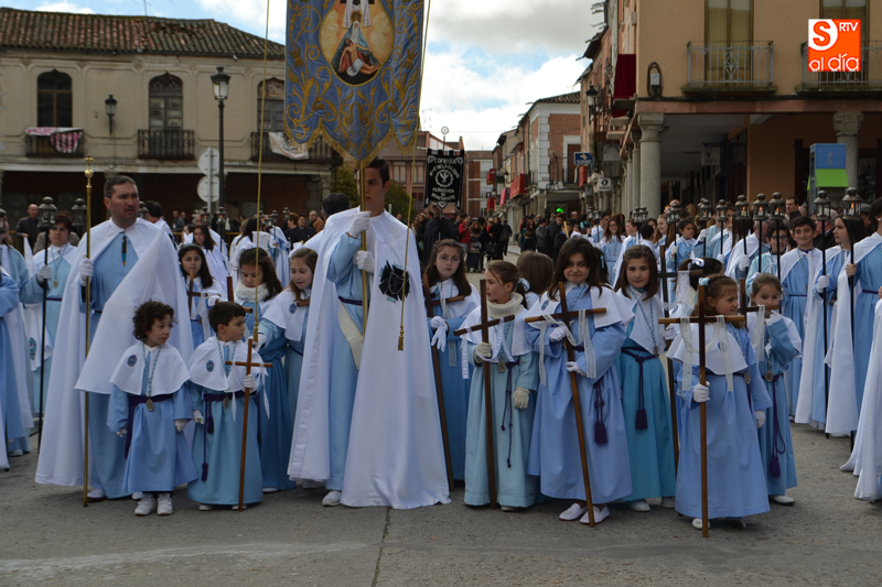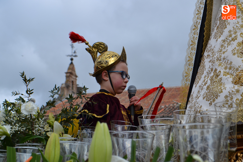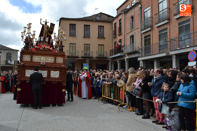 Tras recorrer varias calles del corazón de la ciudad, llegaban hasta el agora donde, una breve oración precedía al gran momento, en el que el pequeño Pablo Manzano, convertido en San Miguel, protagonizaba el momento más simpático y emotivo al pronunciar la letanía que anuncia la resurrección, momento que era acompañado por una sonora ovación por parte de la multitud de vecinos que se agolpaban en los alrededores de la plaza.