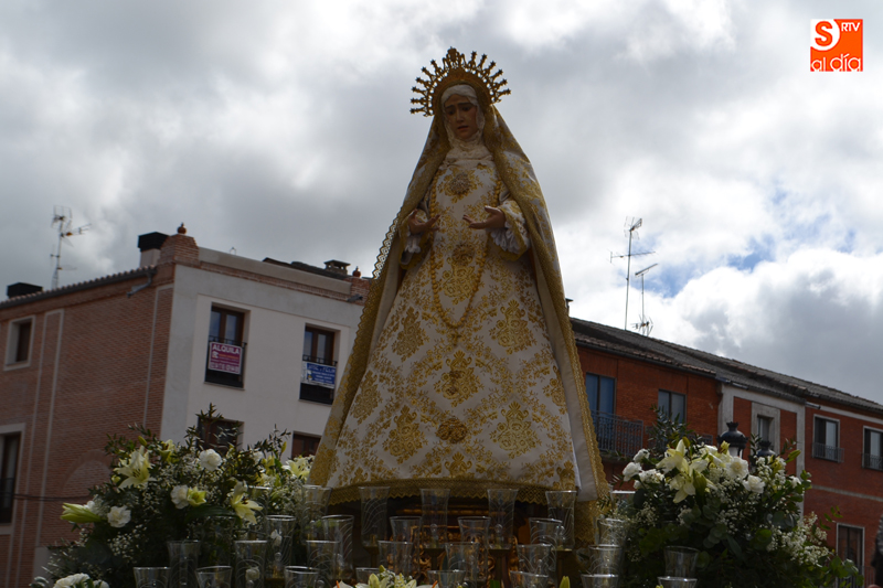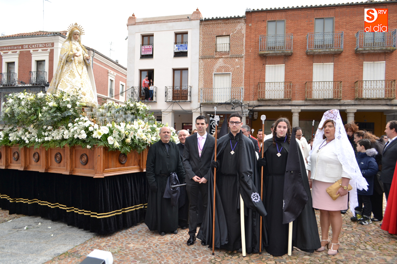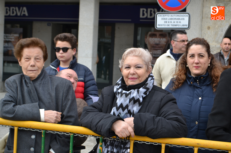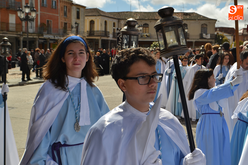 Había muchas ganas de vivir el que sin duda es uno de los momentos de mayor intensidad de la Semana Santa peñarandina y, a pesar del frio y la constante amenaza de lluvia, pudo vivirse con total normalidad, y cientos de personas volvieron a echarse a las calles un año más para vivir la procesión del Resucitado, con la que se cierra la Semana Santa local. Vecinos y visitantes se daban cita durante la mañana del domingo en la Plaza de la Constitución para asistir a uno de los momentos más especiales de la semana de pasión como es el encuentro entre Jesús Resucitado y Nuestra Señora de la Soledad, en el que un pequeño ataviado como el Arcángel San Miguel anuncia la resurrección y procede a desprender el manto de luto que hasta ese momento ha lucido la virgen como muestra de su dolor.