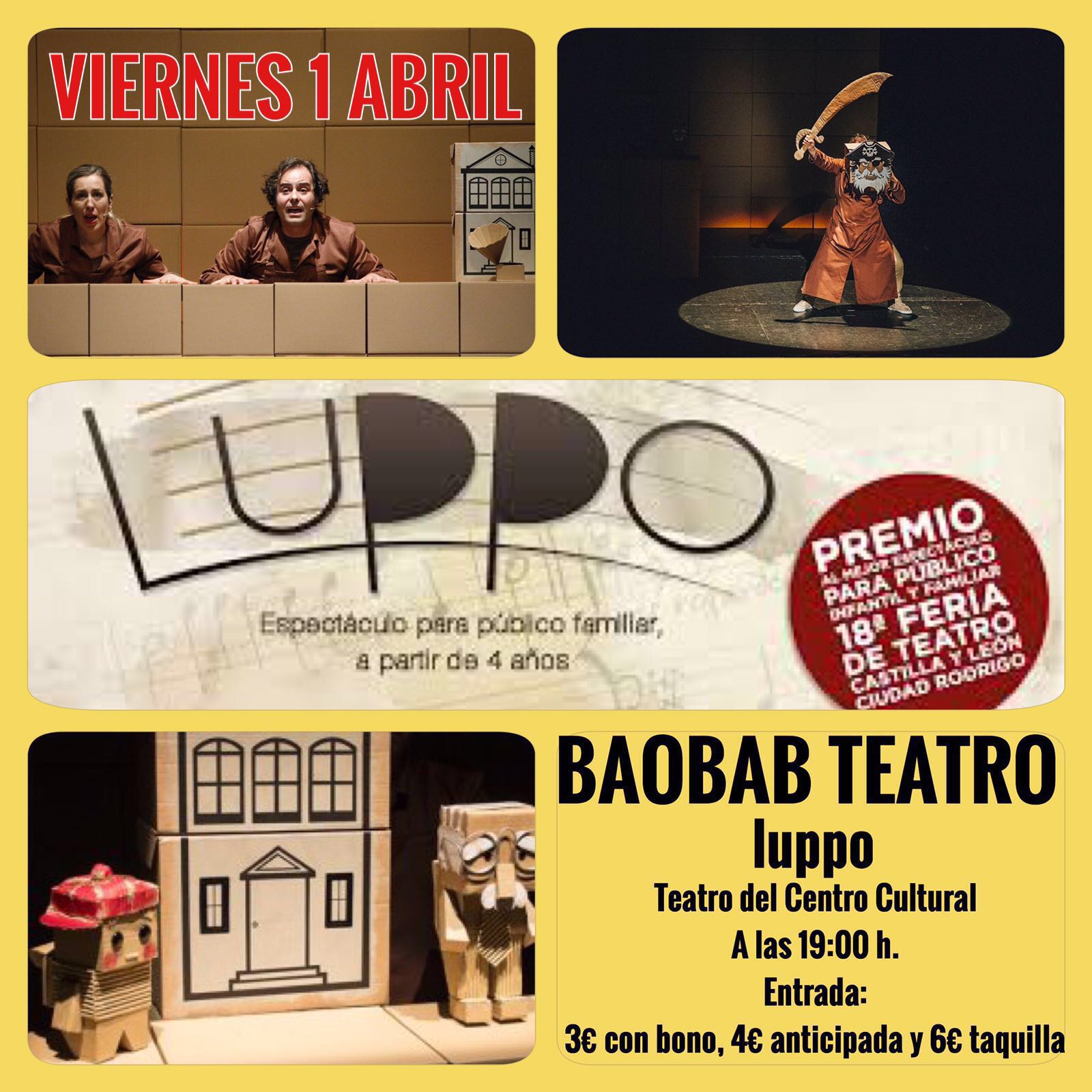 El Centro Cultural de Guijuelo abre el próximo viernes, 1 de abril a las 19.00 horas, la programación del mes con la obra de teatro infantil 'Luppo' de la compañía gallega Baobab Teatro. 'Luppo', ganadora del premio al Mejor Espectáculo Infantil en la XVIII Feria de Teatro de Castilla y León 2015, para la que fue seleccionada de entre más de mil propuestas, se integra dentro del programa Circuitos Escénicos que a lo largo de este año recalarán en Guijuelo y se podrá ver por 3 euros las personas con bono, 4 euros las que saquen la entrada de forma anticipada y 6 euros aquellas que lo hagan en la taquilla.