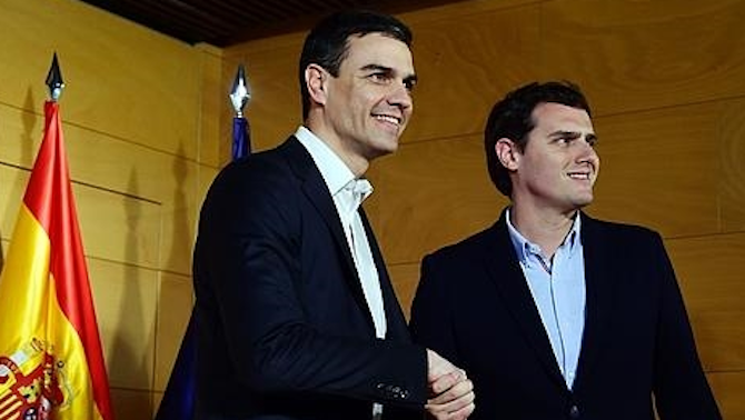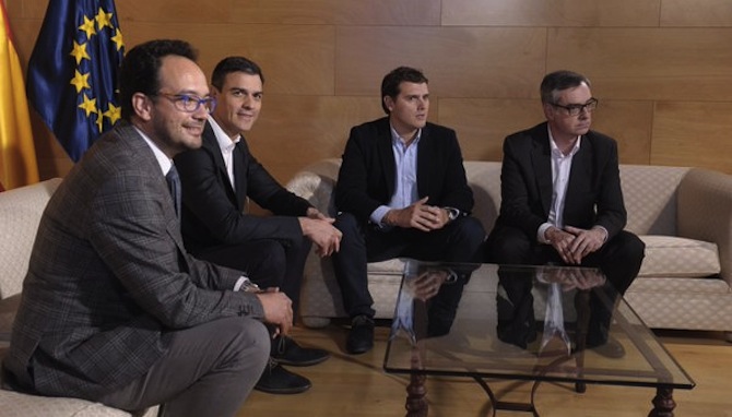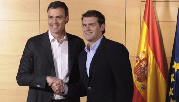 El secretario general del PSOE, Pedro Sánchez y el presidente de Ciudadanos, Albert Rivera, han reafirmado este martes su acuerdo de investidura, que consideran "más vigente que nunca", y lo han hecho la víspera de que el líder socialista se reúna este miércoles con el secretario general de Podemos, Pablo Iglesias.