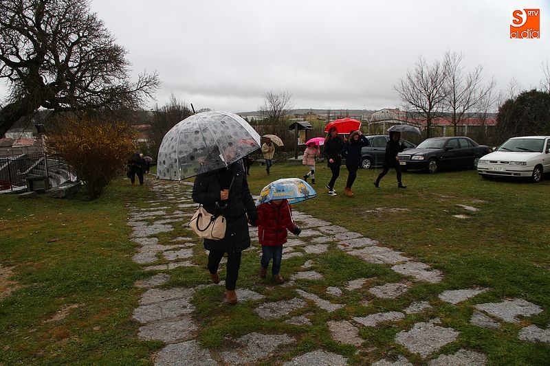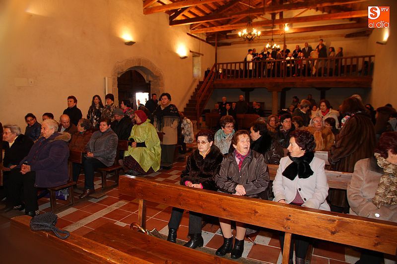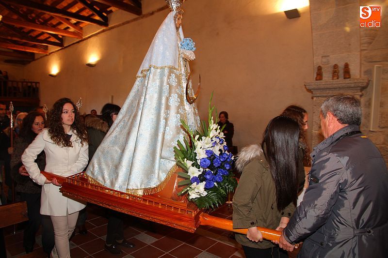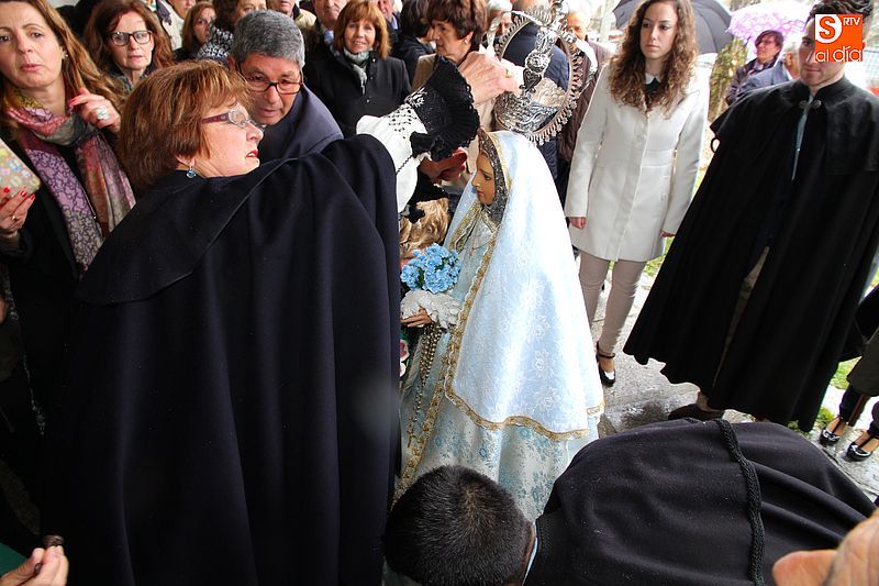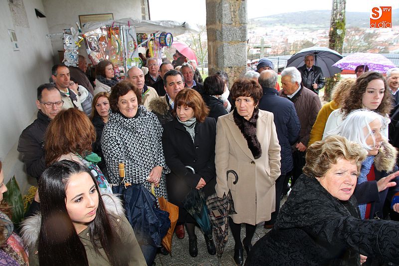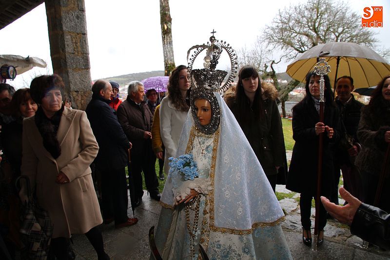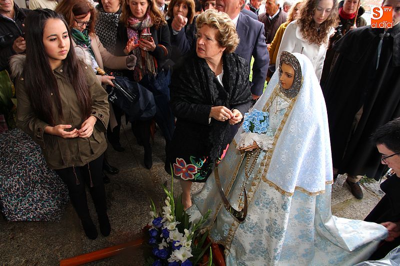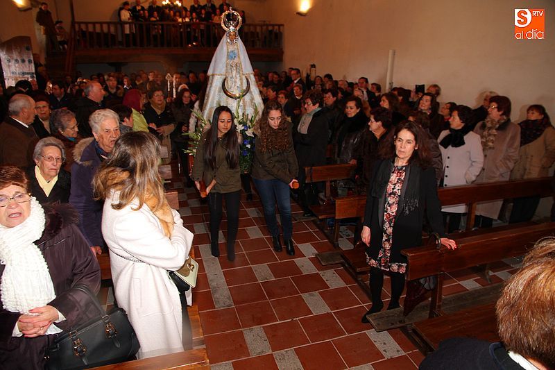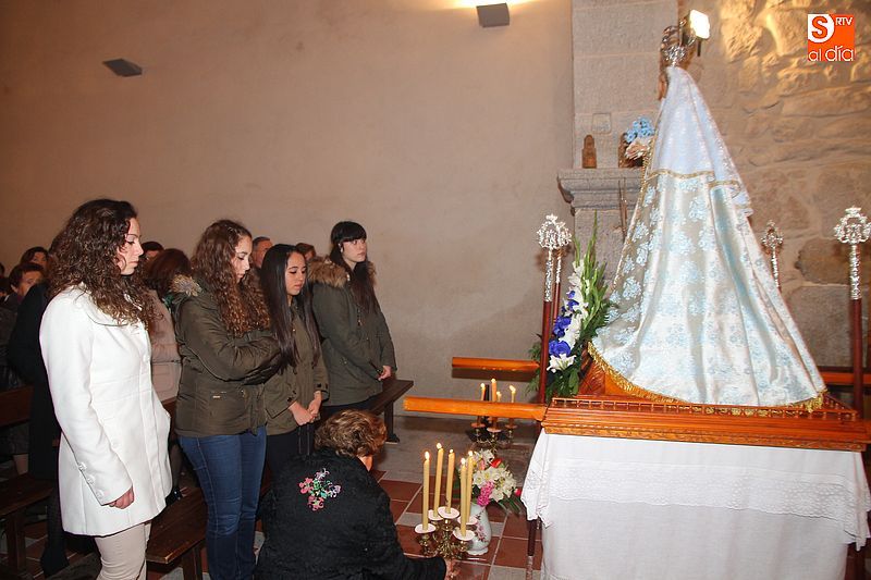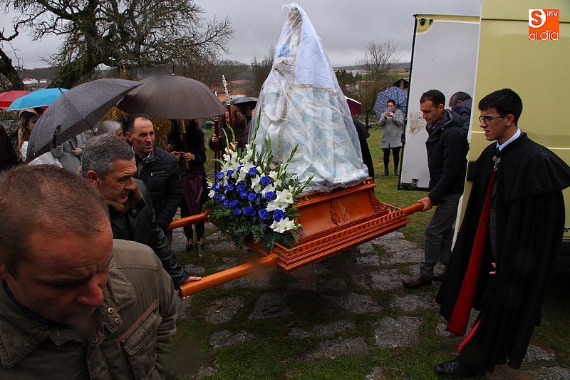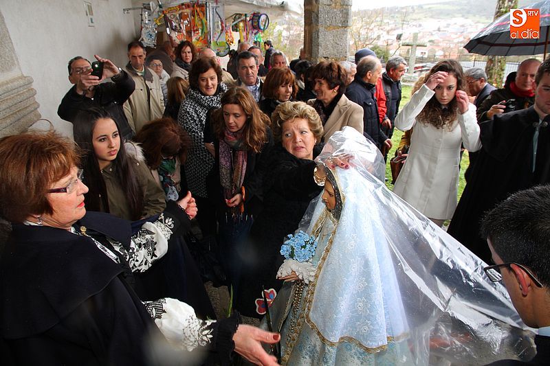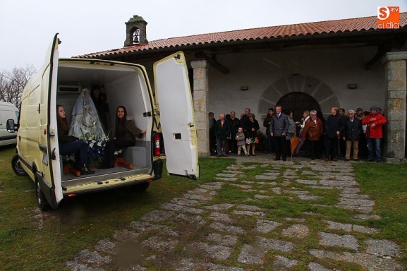 a y segura para la figura de la Patrona, que fue custodiada en el vehículo por los quintos del pueblo. A su llegada a la ermita, no sin dificultades por el embarrado camino, se portó la tradicional cruz de la virgen y se recolocó la corona que le había sido retirada para el breve desplazamiento. Los quintos portaron entonces la imagen al interior del templo, acompañados por la corporación municipal, dejando todo listo para el inicio de la tradicional misa. Por la tarde se celebró el tradicional ofertorio y subasta a beneficio de la ermita.