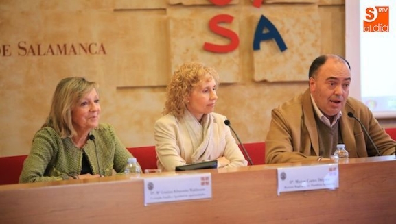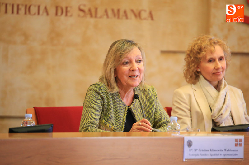 La rectora de la Universidad Pontificia de Salamanca, Mirian de las Mercedes Cortés Diéguez, y la concejala de Familia e Igualdad de Oportunidades, Mª Cristina Klimowitz Waldmann, han inaugurado las jornadas 'Familia y Educación en el siglo XXI: formación parental para los nuevos retos sociales', este jueves, en el Aula de Grados.