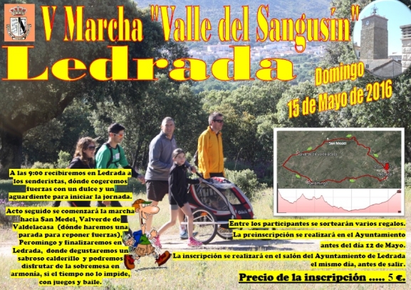 El Ayuntamiento de Ledrada ya lo tiene todo listo para la nueva edición de la marcha 'Valle del Sangusín'. La nueva cita con la naturaleza tendrá lugar el próximo domingo 15 de mayo. El plazo de preinscripción ya está abierto y se mantendrá abierto hasta el próximo 12 de mayo. La inscripción final se realizará en el salón del Consistorio el mismo día de la marcha.
