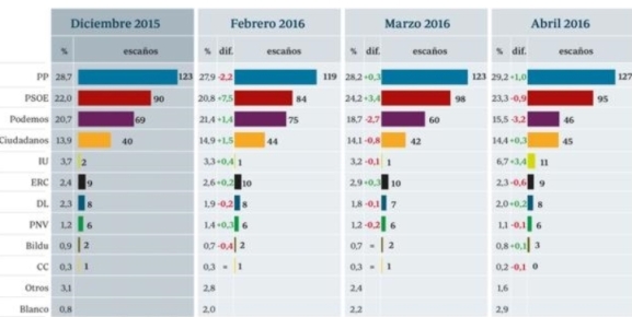 En marzo, el PSOE fue el principal beneficiario de la caída de Podemos. Pedro Sánchez llevaba la iniciativa política, primero en su investidura que resultó fallida, pero también después, cuando mantuvo su intención de llegar a un acuerdo «de cambio». Los socialistas alcanzaron la punta más alta de los últimos meses, con un 24,2 por ciento de estimación de voto y 98 escaños. En abril, sin embargo, ha retrocedido casi un punto, a la vista del fracaso de Sánchez y la inutilidad de las negociaciones a dos bandas, con Ciudadanos y Podemos, que ha llevado a cabo. Con todo, sus 95 escaños en este momento seguirían mejorando los 90 que obtuvo el 20-D.