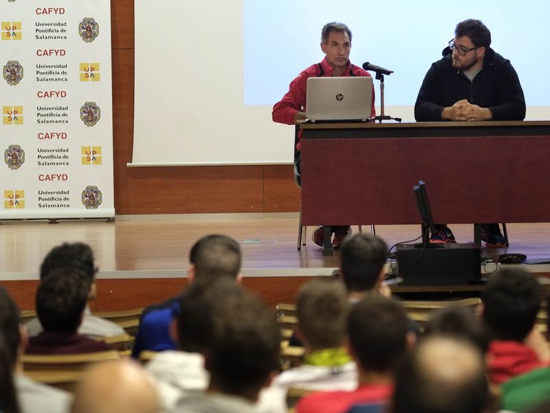 El plusmarquista nacional de Lanzamiento de Martillo, Javier Cienfuegos, y su entrenador, Antonio Fuentes, han participado en una clase magistral para los alumnos y profesores del Grado en Cafyd.