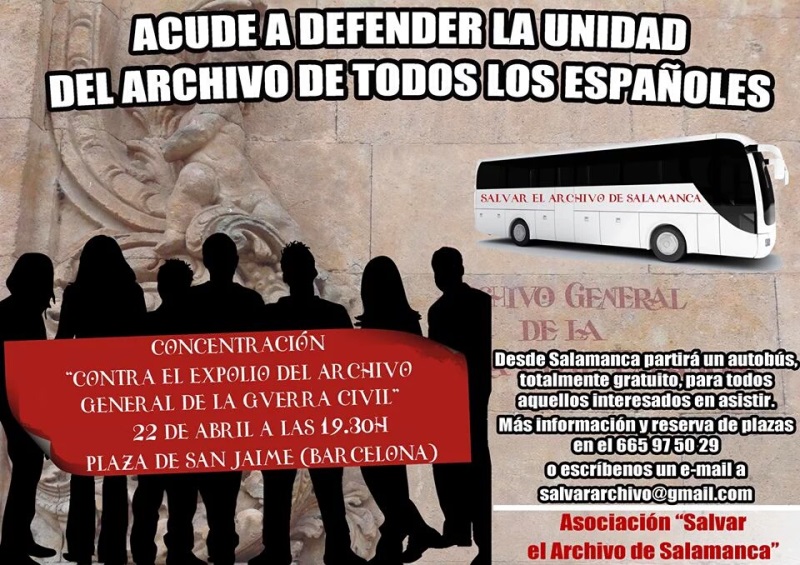Será el 22 de abril, para participar en una manifestación por los motivos citados, que se realizará en la plaza de San Jaime, a las 19.30 horas.El autobús será gratuito y los interesados pueden reservar su plaza en el 665.975.029 o en el correo salvararchivo@gmail.com