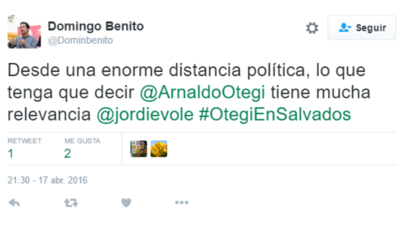 Domingo Benito añadió que "Otegi no tiene autoridad moral para decir determinadas cosas pero representa un importante sector de los votantes", recalcando que el expresar que su opinión es "relevante no quiere decir que esté a favor de ello: hay una distancia abismal". Minutos después, Domingo Benito colgaba el siguiente tweet en las redes sociales:
