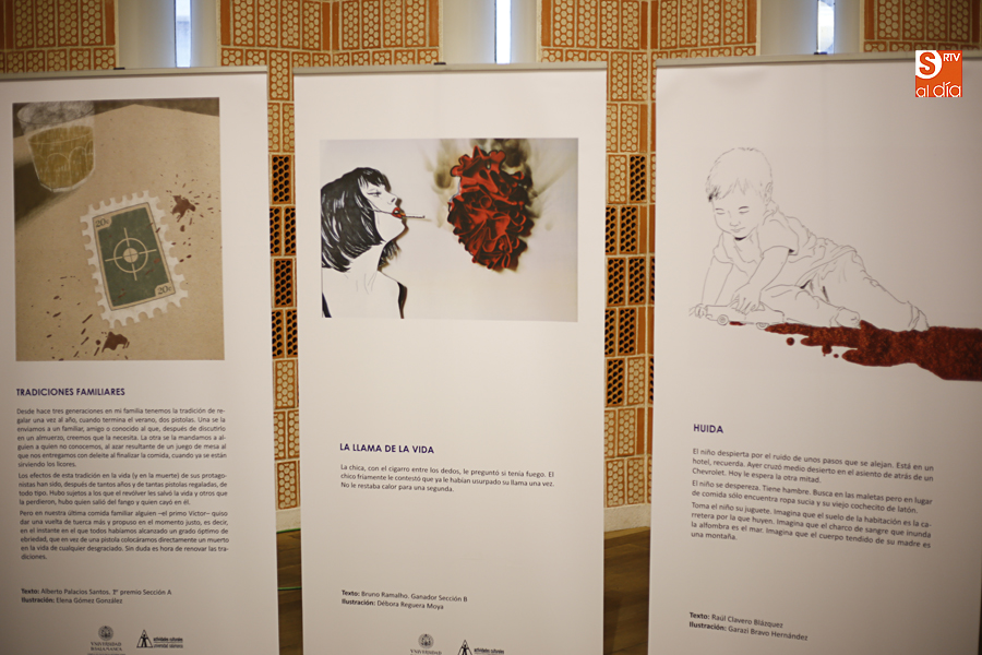 Además, los seleccionados finalistas fueron Elena Gómez González, licenciada en Bellas Artes por la Usal (2009-2014), por el microrrelato 'Tradiciones familiares' de Alberto Palacios Santos; Antonio Juan Sánchez, alumno de doctorado de Informática, por el microrrelato 'La Pelota', de Luis Martínez Campo; Débora Reguera Moya, estudiante de 4º Curso del Grado de Blleas Artes, por el microrrelato 'La llama de la vida', de Bruno Ramalho; Emanuel Lomeña Valbuena, estudiante de 4º Curso del Grado de Bellas Artes, por el microrrelato 'Notación alfabética' de María Teresa López de la Fuente; Diego Sánchez García, estudiante de 4º Curso del Grado de Psicología, por el microrelato 'Recuerdos', de Alicia Isabel León Lobera; Garazi Bravo Hernández, estudiante del Máster de Animación Digital, por el microrrelato 'Huida', de Raúl Clavero Blázquez; Carmen Sánchez Tamarit, estudiante de 2º Grado en Historia del Arte, por el microrrelato 'Rupture', de Clara Grande López; y Cristina Vega Carcedo, estudiante de 4º Curso del Grado de Bellas Artes por el microrrelato 'Y vértigo', de Sofía Sangrador del Río.