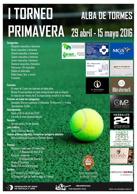 El Club Deportivo Tenis Alba de Tormes ultima los preparativos para el comienzo del I Torneo Primavera de tenis, pádel y frontenis, que se va a disputar los fines de semana, incluyendo viernes por la tarde, entre el 29 de abril y el 15 de mayo.
