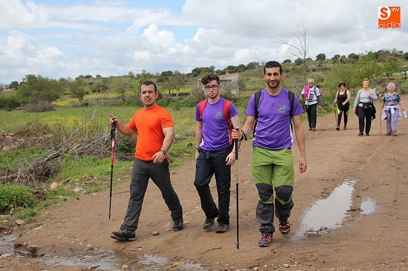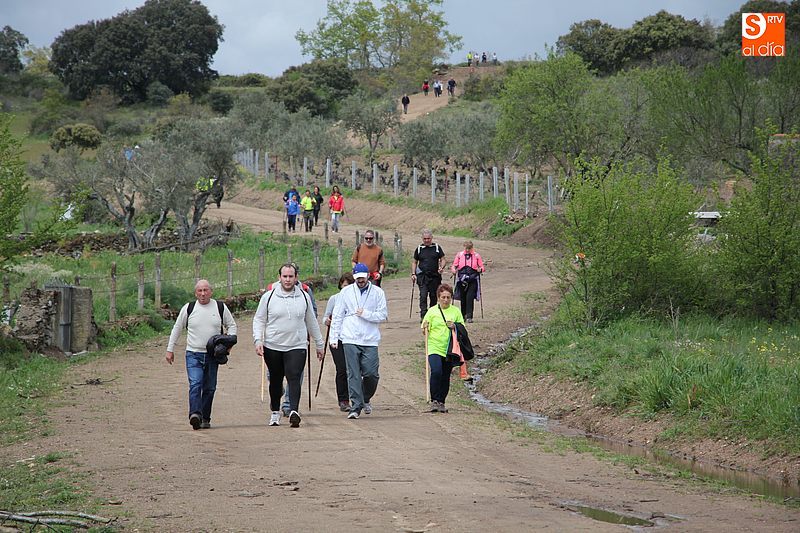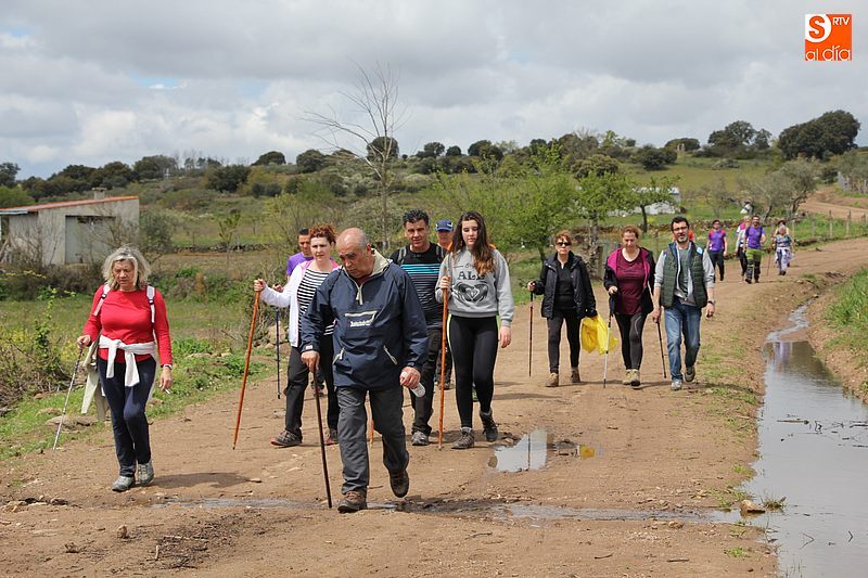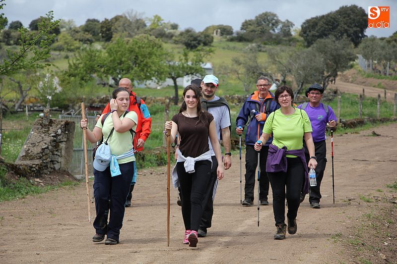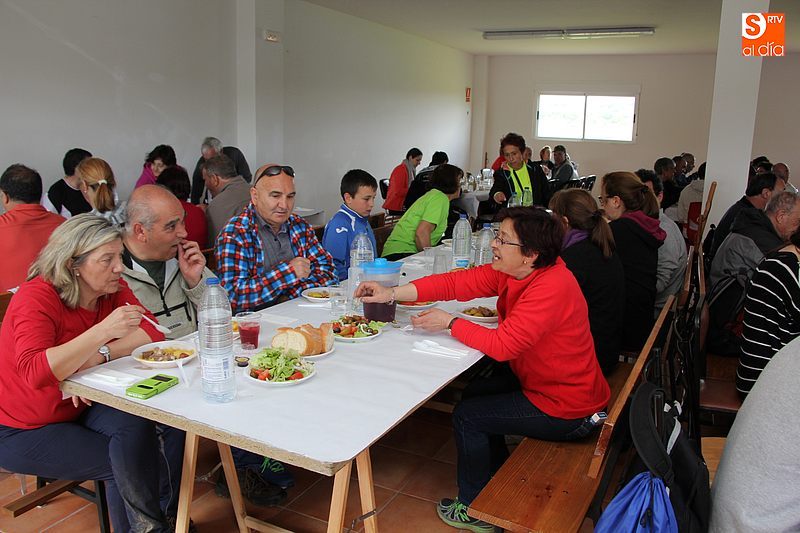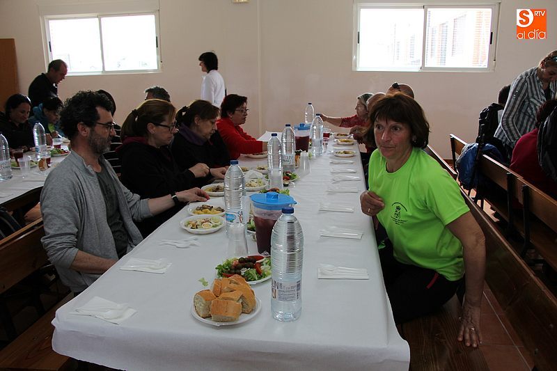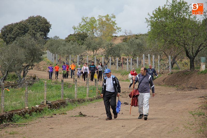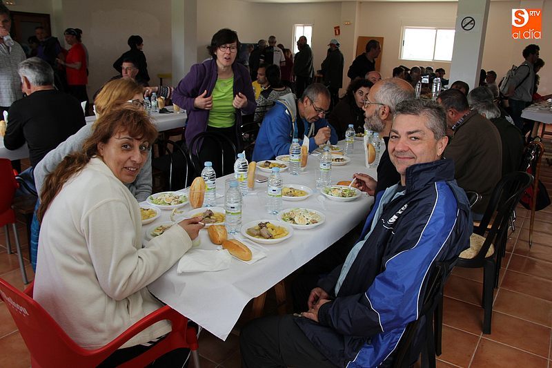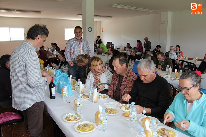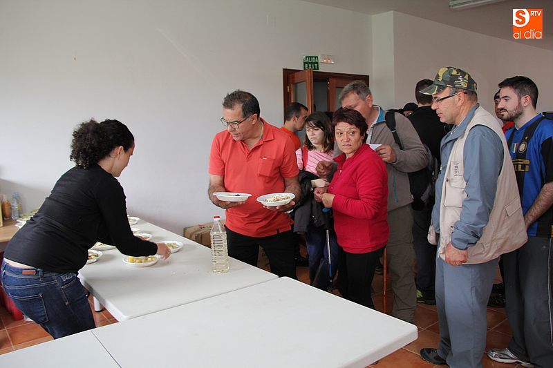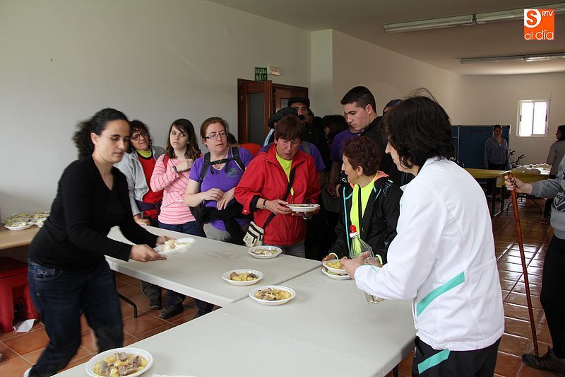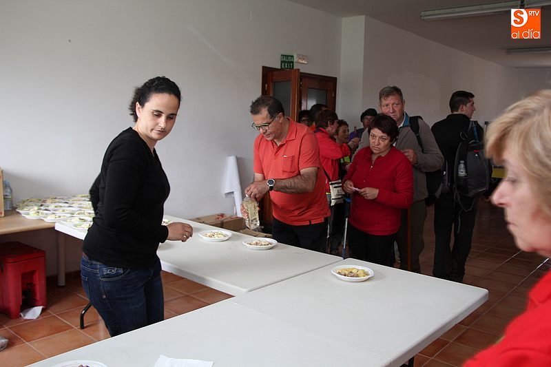 Pasadas las nueve de la mañana los senderistas comenzaban a agruparse en la plaza del Ayuntamiento para coger el ticket de la comida, otros para formalizar la inscripción y todos para recibir una curiosa bolsa conmemorativa de esta edición de la marcha. Así, los senderistas comenzaban los 10 kilómetros del recorrido pasadas las 9.30 horas dirección hacia los Rosales, para continuar por Valdollero y rodear el teso de la ermita para salir por el Cuarto del Sol y el Picón de la Tabla. El último tramo atravesaba el paraje de las Vicarías hasta alcanzar el camping, donde darían cuenta de la comida en el edificio multiusos, ensalada mixta y patatas con costilla preparadas por las cocinas del camping y de El Legado de Enrique.