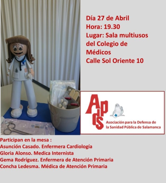 La Asociación para la Defensa de la Sanidad Pública de Salamanca celebrará el próximo miércoles, 27 de abril, una mesa redonda sobre 'Prescripción de enfermería'. El acto tendrá lugar a partir de las 19.30 horas en la sala multiusos del Colegio de Médicos, situada en la calle Sol Oriente, 10