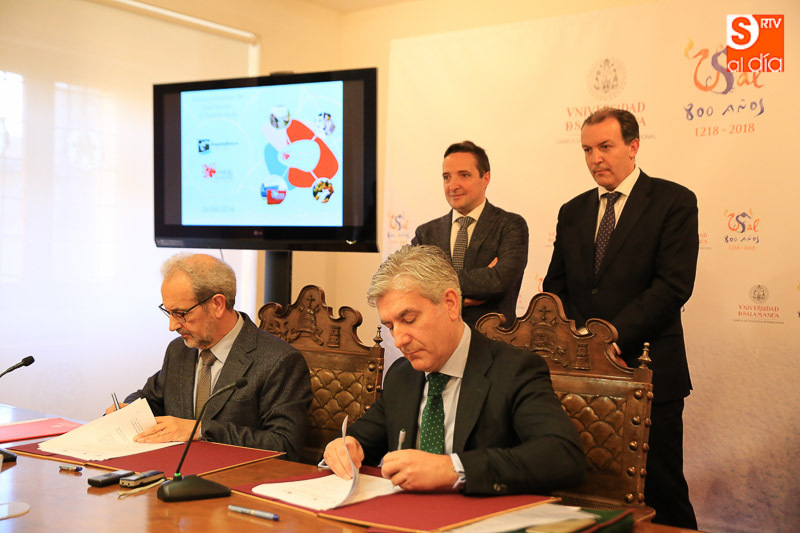 Daniel Hernández Ruipérez, rector de la Universidad de Salamanca, y Carlos Ranera González, director general de Banca Comercial de EspañaDuero han suscrito el convenio de patrocinio "Global U-Talent-Hub Oro". Ambas instituciones buscan fomentar la investigación científica, el desarrollo tecnológico y la cultura emprendedora a través del U-Talent-Hub, plataforma del Parque Científico de la Universidad de Salamanca creada para impulsar un tejido de empresas innovadoras entorno a la Universidad.