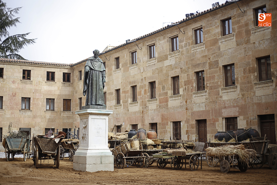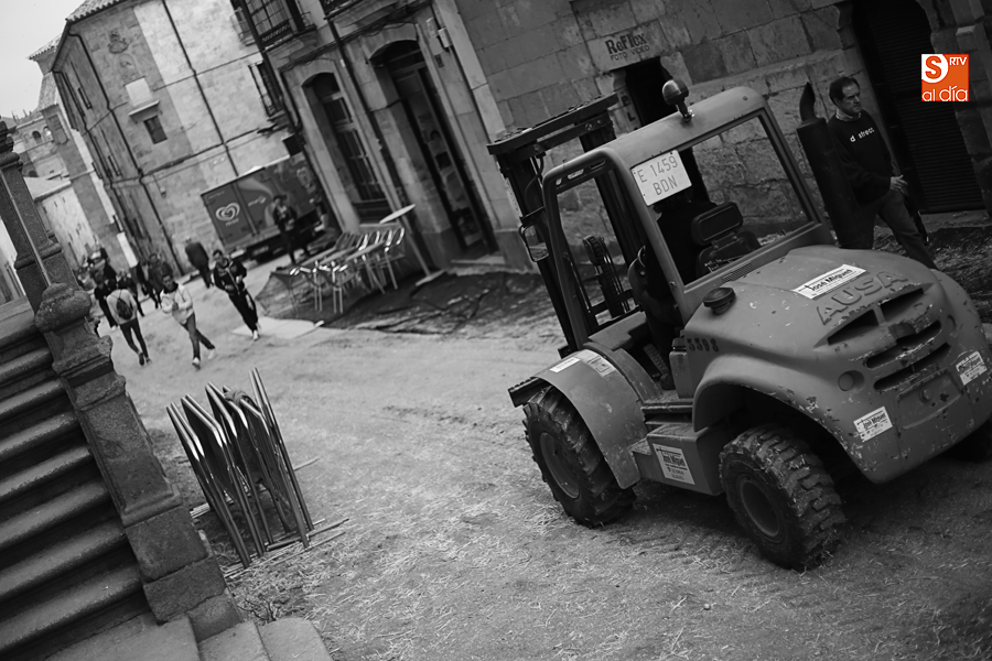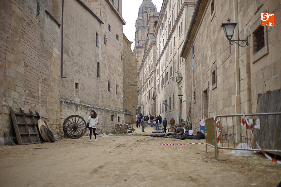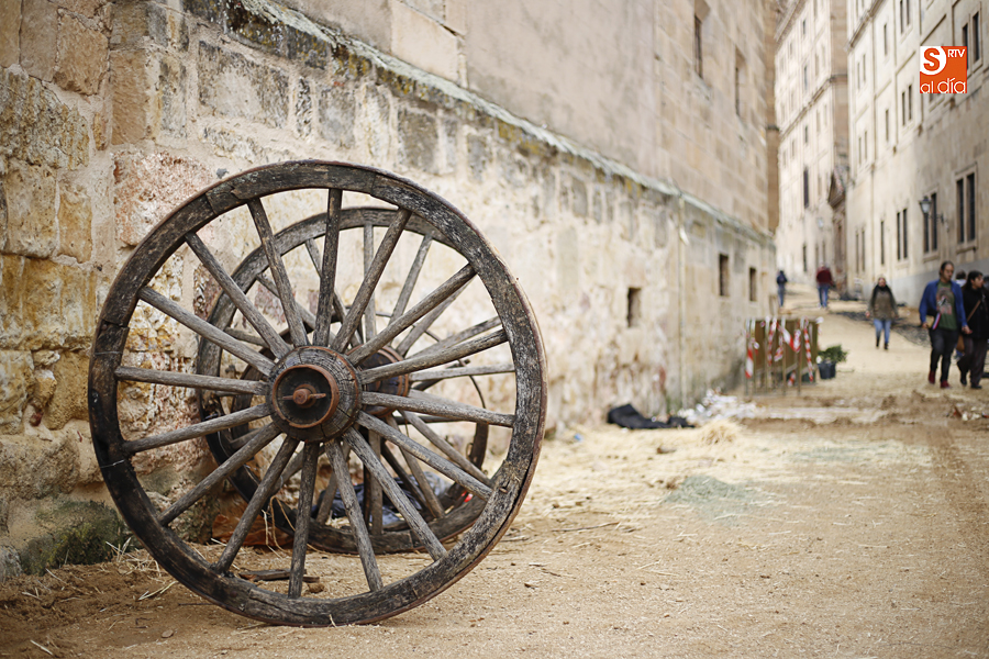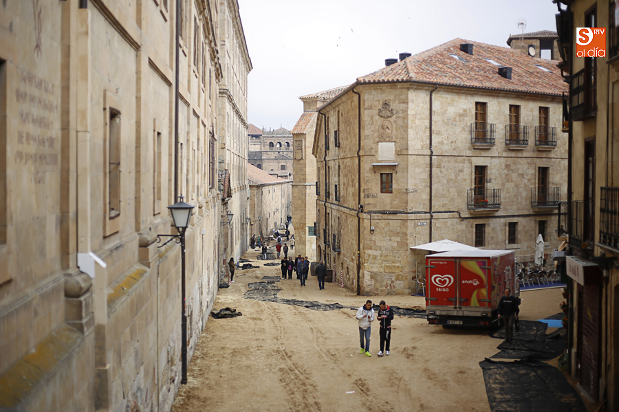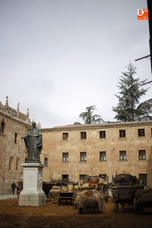 Tras las escenas rodadas en la calle Compañía, ahora es el Patio de Escuelas donde la productora está "vistiendo" de época este espacio, junto al Edificio Histórico de la Universidad de Salamanca, con una gran capa de tierra que ayudará a ambientar la emblemática plaza.