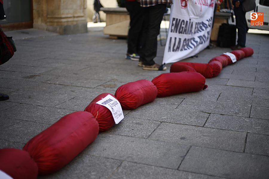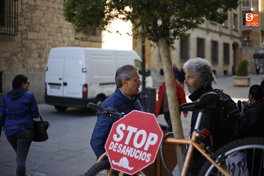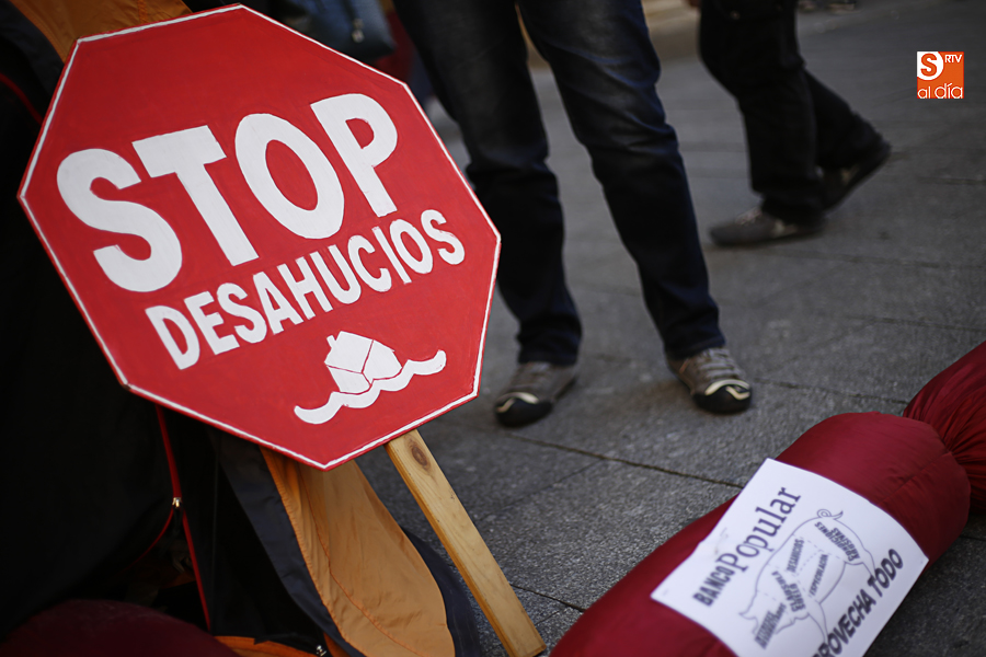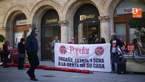 Embutido gratis para denunciar que "no hay chorizos como los del Popular". Es la iniciativa que ha llevado a cabo Stop Desahucios Salamanca, junto a la sucursal de esta entidad en la calle Zamora, para exigir "que el banco elimine la deuda a un compañero desahuciado".