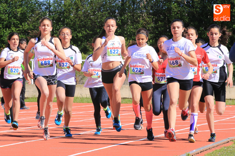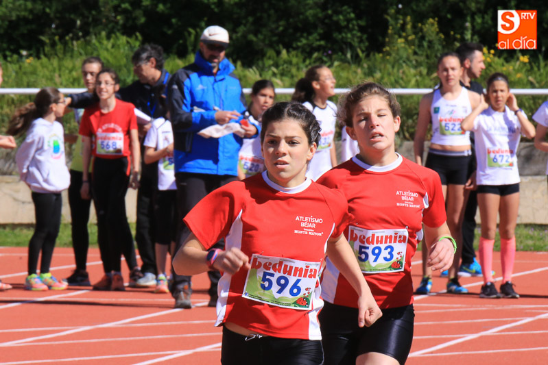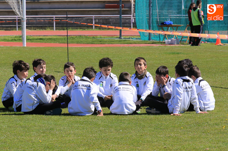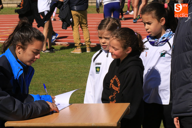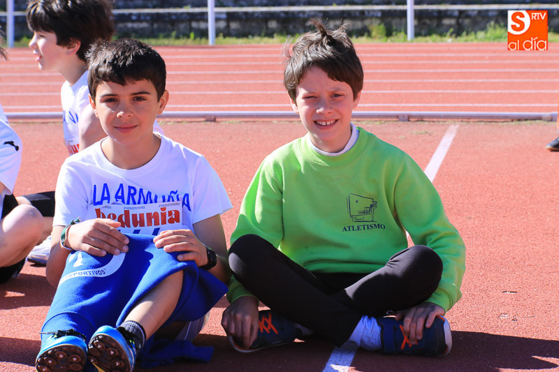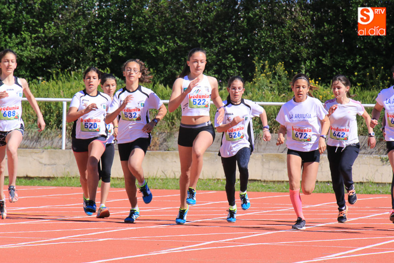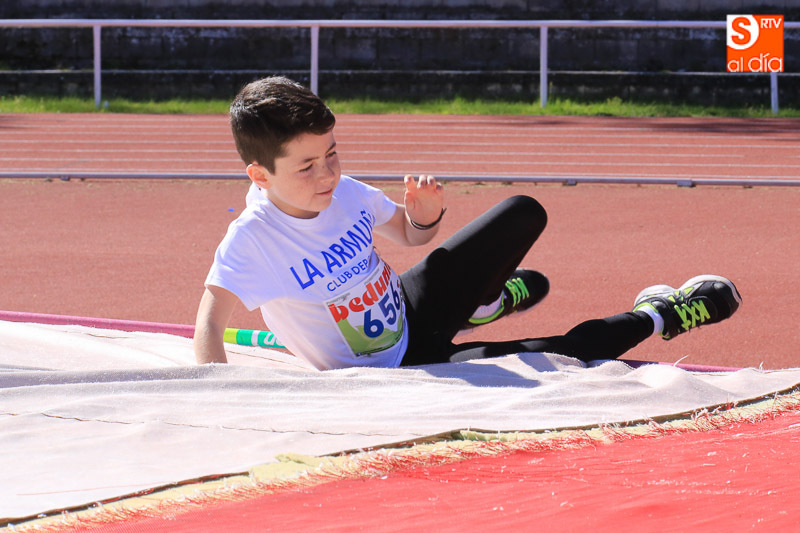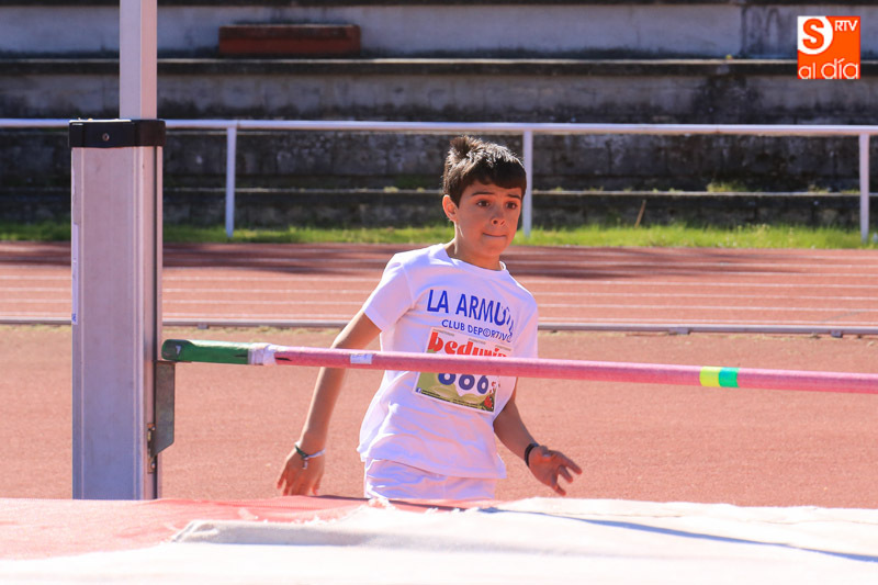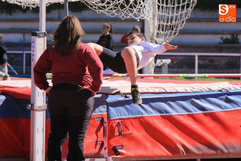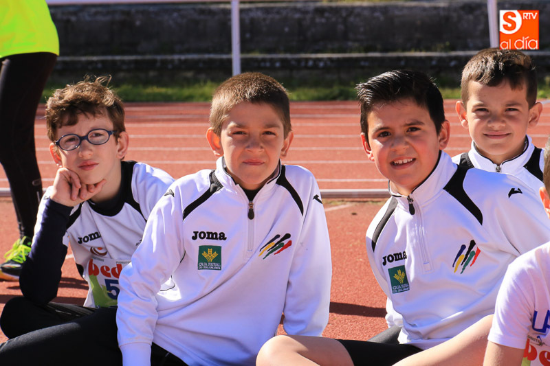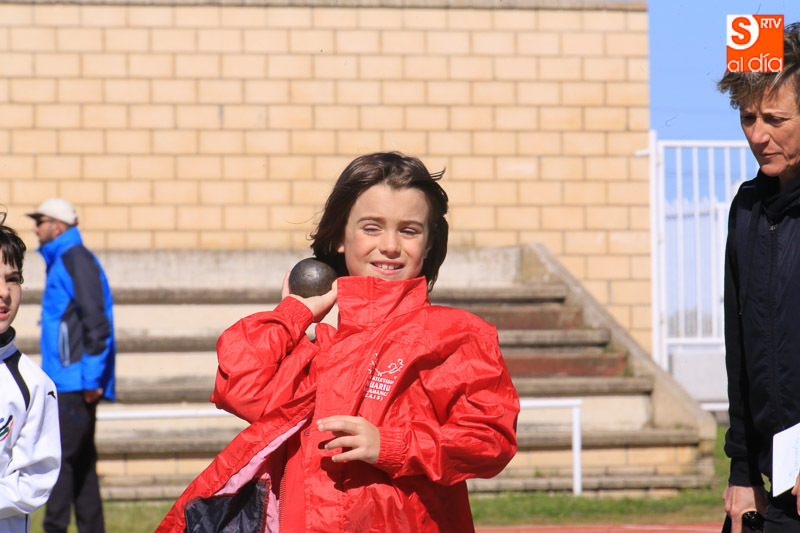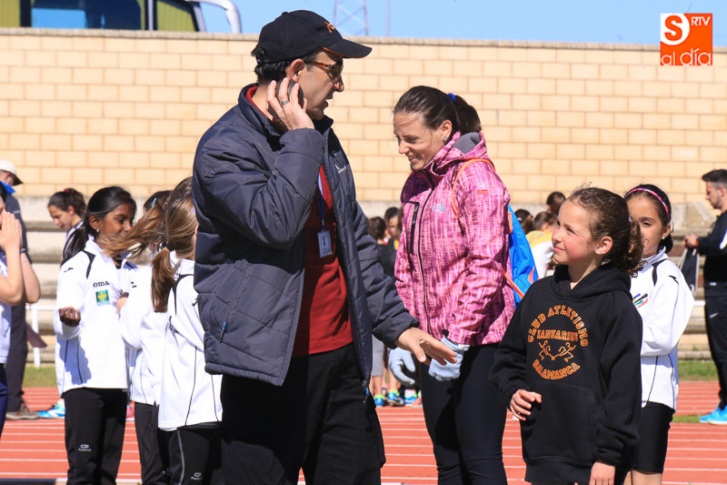 Han sido más de 300 niños y niñas representantes de los clubes, ayuntamientos y centros escolares salmantinos, de las categorías benjamín, alevín, infantil y cadete, los que se han dado cita esta mañana desde las 10:30h hasta las 14:00, para la disputa de las 24 pruebas programadas de las especialidades de velocidad, medio fondo, vallas, saltos, lanzamientos y el reparto de las 72 medallas que se otorgaban a los tres primeros clasificados de cada una de las pruebas celebradas.