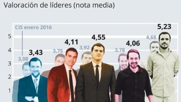 El CIS también incluye una valoración de los líderes políticos. El dirigente mejor valorado es Alberto Garzón (IU) con 5,23 puntos en una escala del 1 al 10; el peor es Mariano Rajoy, con 3,43 puntos. Tras Garzón es el presidente de Ciudadanos es el que saca mejor nota con un 4,55; seguido del socialista Pedro Sánchez, 4,11 y del secretario general de Podemos con 4,06.