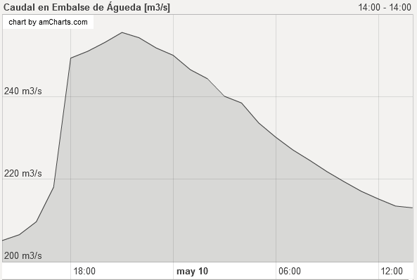 El primer punto donde el río entró en situación de alerta fue en su salida del pantano del Águeda. Tras sufrir un fuerte aumento en el caudal durante la tarde del lunes (se pasó de 205,16 metros cúbicos por segundo a las 14.00 horas a 249,34 m3/s a las 18.00 horas), el volumen continuó subiendo poco a poco hasta alcanzar su tope entre las 21.00 y las 22.00 horas.