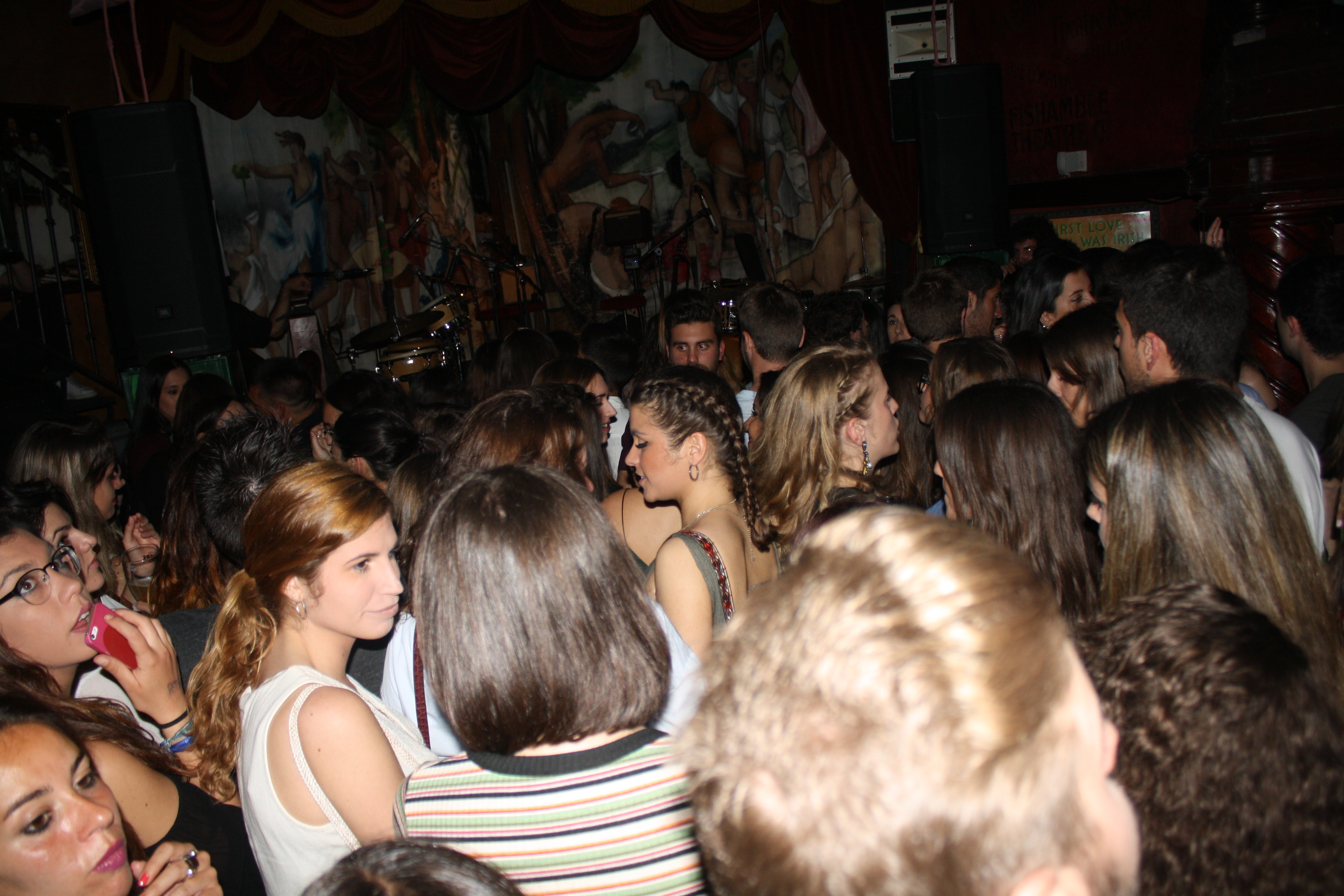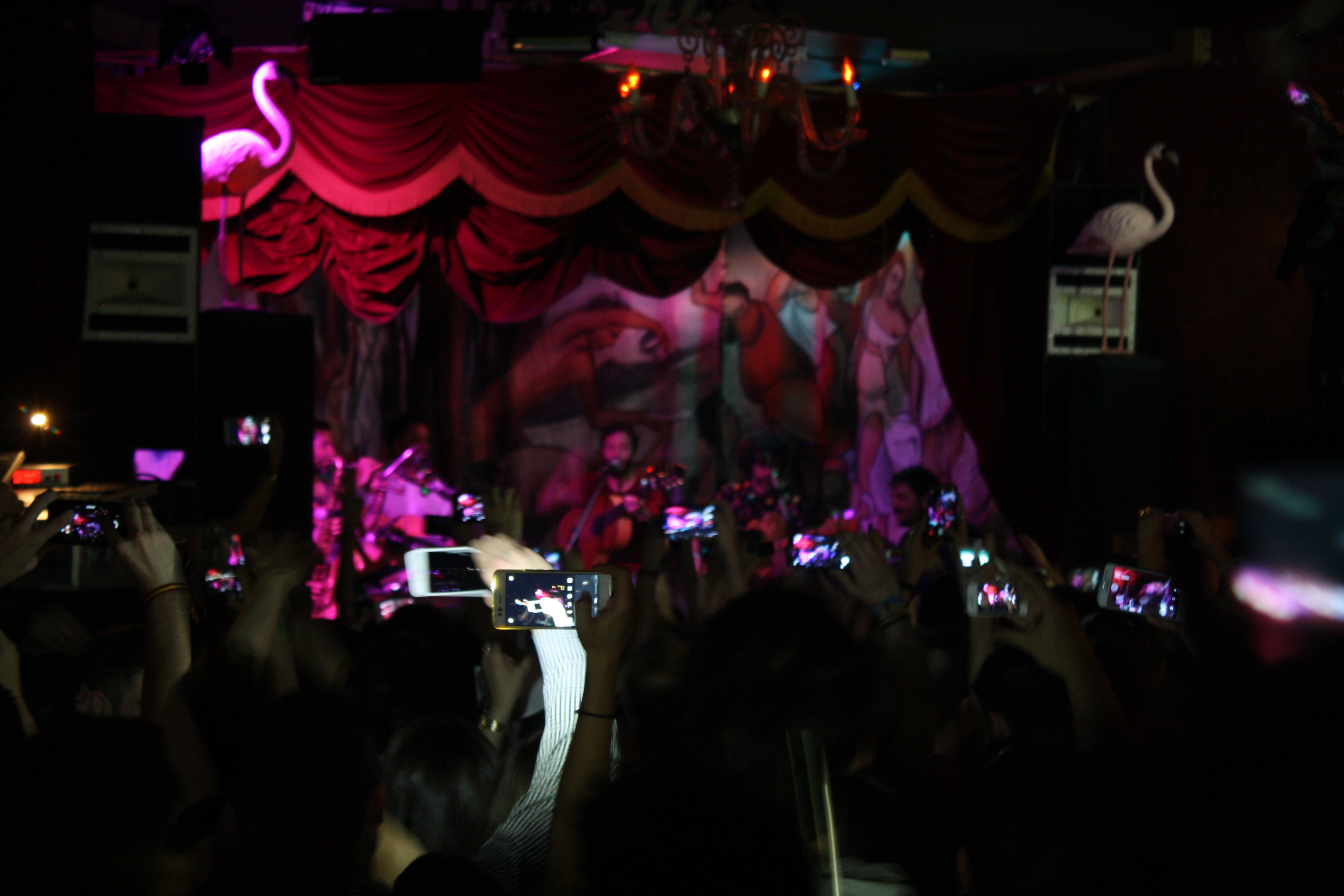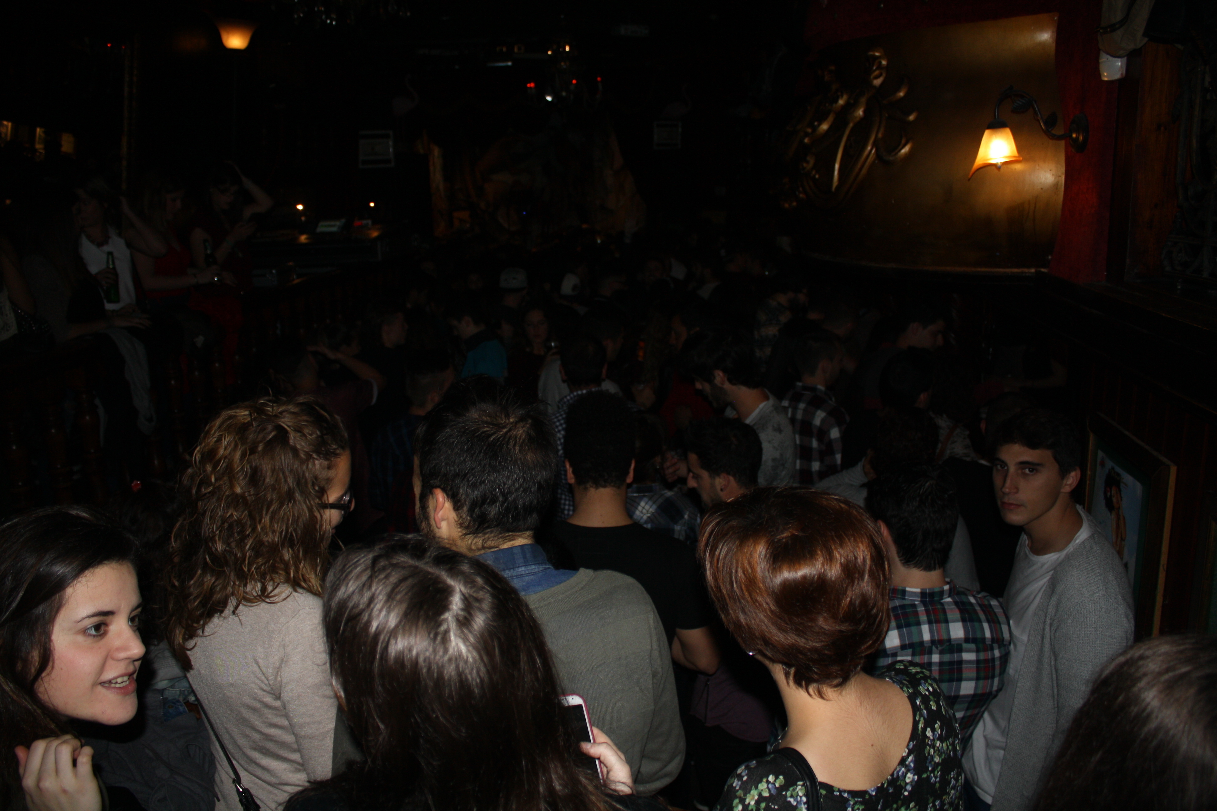 La primera impresión de la noche se formó entre el crepúsculo y algunas borrosas gotas de lluvia; la aparente larga cola revestida de paraguas avanzó ágilmente hasta el portero, donde el staff funcionó perfectamente a la hora de permitir una cómoda integración en la sala. Allí dentro, lo primero que llamó la atención fue el distendido ambiente, apoyado por unos precios de bar muy recomendables y la presencia buenrollera de algunos miembros de la banda (el bajista Fernando Lamadrid y el trompeta Enrique Rodriguez). Tras algunas interacciones, cigarros, sonrisas, fotos, conversaciones, y cabe decir, problemas con el espacio y su agresiva posesión por parte de algunos individuos del público, la gente se preparó para el comienzo de de las primeras notas musicales de la velada.