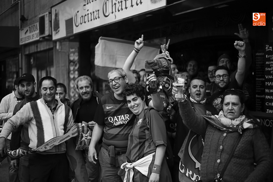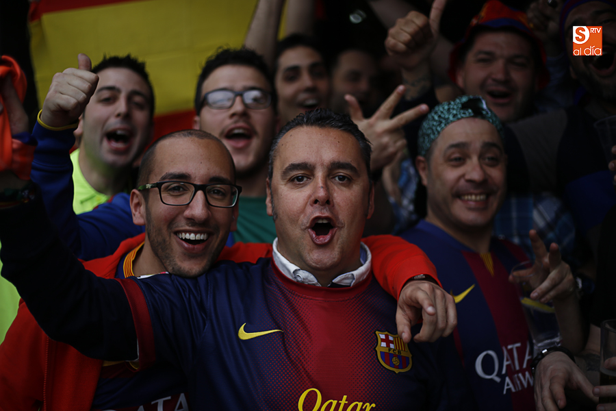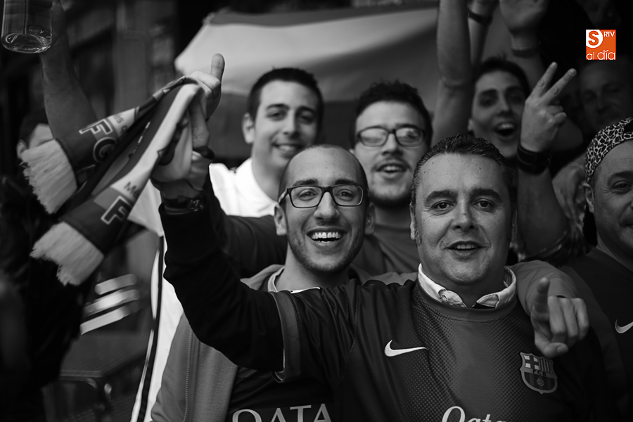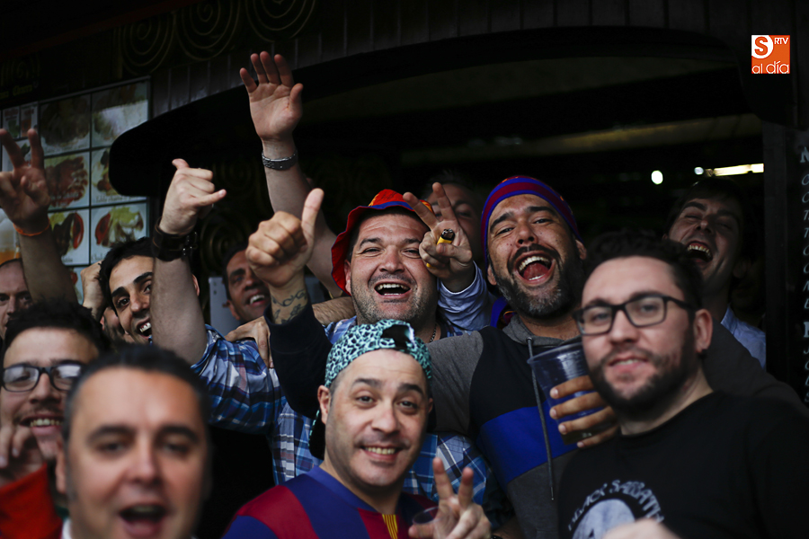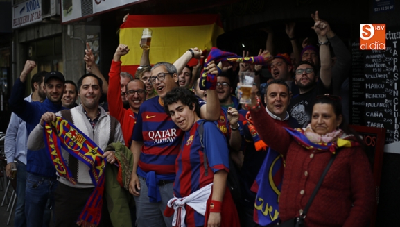 Los aficionados del Barcelona que residen en Salamanca festejaron este sábado el título de Liga del conjunto 'culé'. Las cafeterías y los bares de la periferia y del centro de la ciudad se llenaron para ver el partido decisivo de la temporada, el que decidía el título para el Barça o para el Real Madrid.