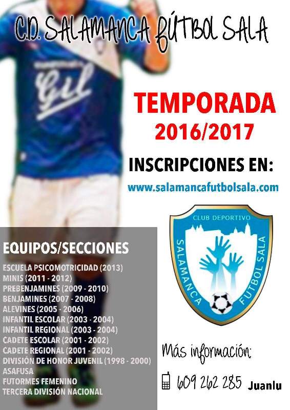 El CD Salamanca FS abre el periodo de captación para sus equipos de fútbol sala base. Los interesados en formar parte de este club para la próxima temporada 2016-2017 puede hacer su solicitud a través de la web del club www.salamancafutbolsala.com.