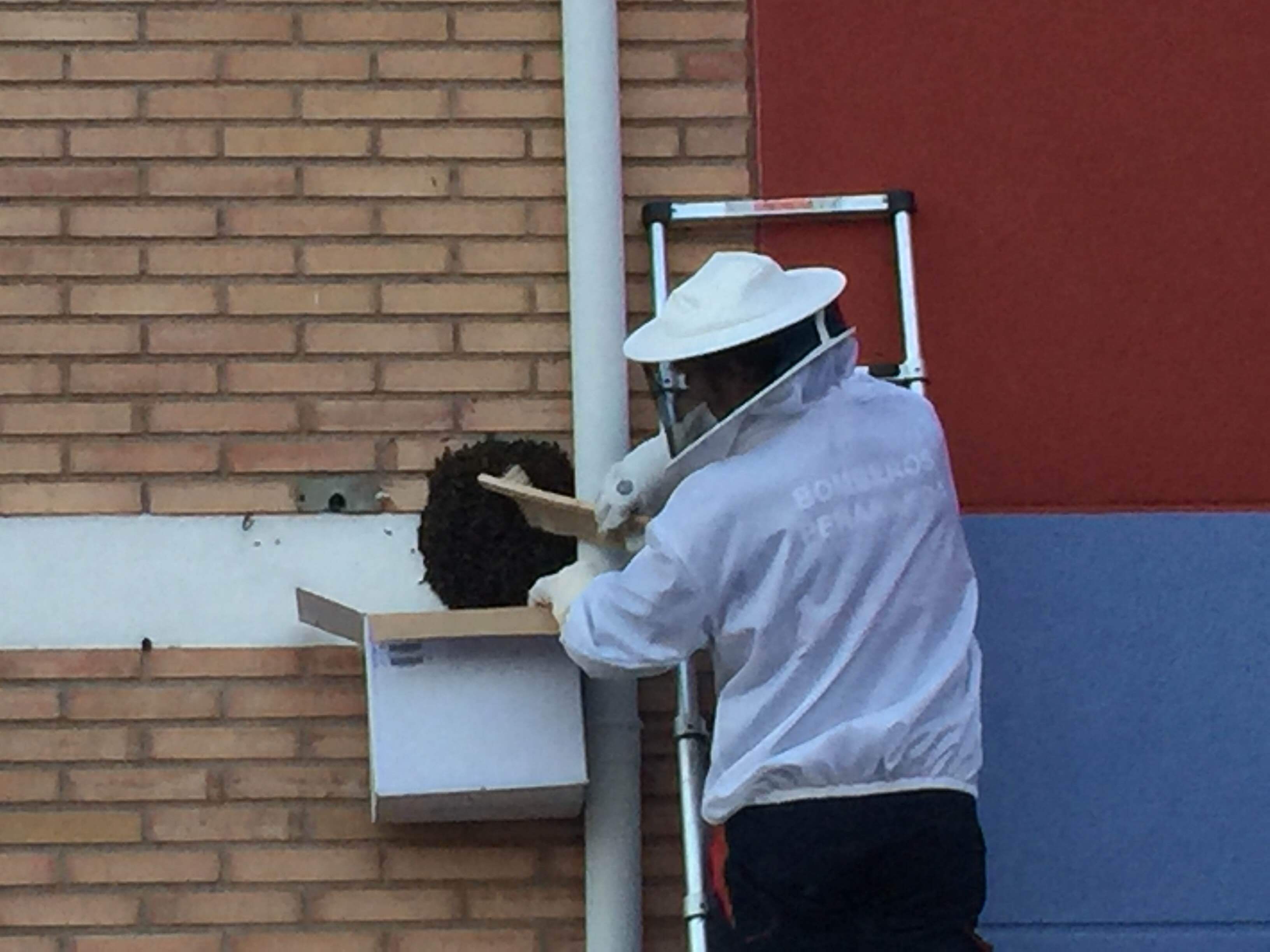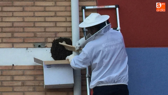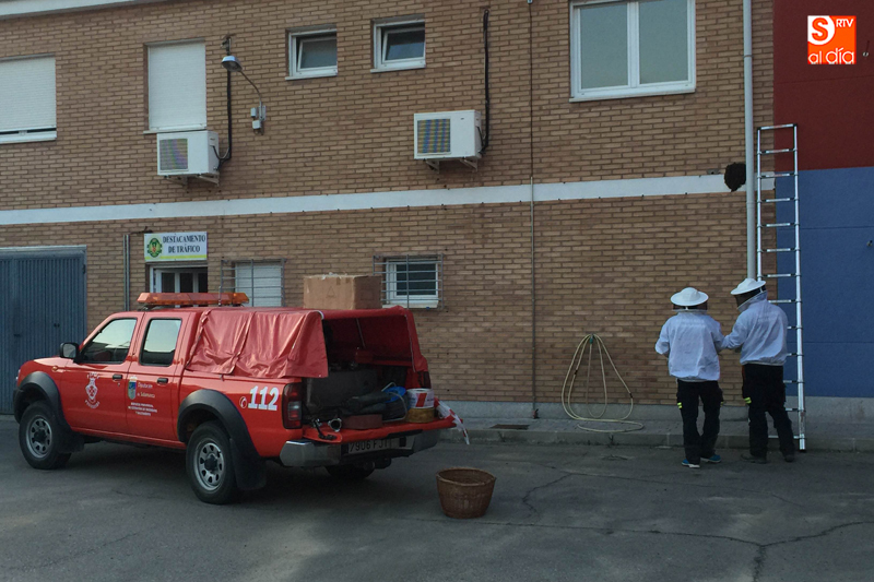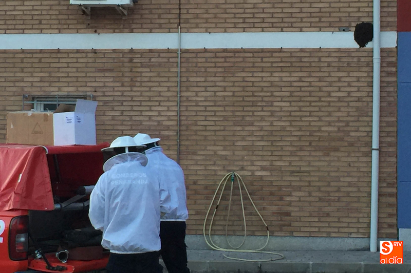 Los Bomberos de Peñaranda han realizado una nueva actuación de urgencia para recoger un enjambre de abejas en la ciudad. Operarios del cuerpo recibían una llamada alertando de una gran concentración de abejas en la fachada de uno de los edificios internos del cuartel de la Guardia Civil, y que comenzaba a generar alarma entre agentes y residentes.