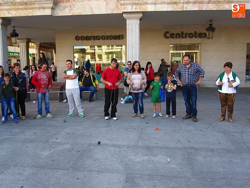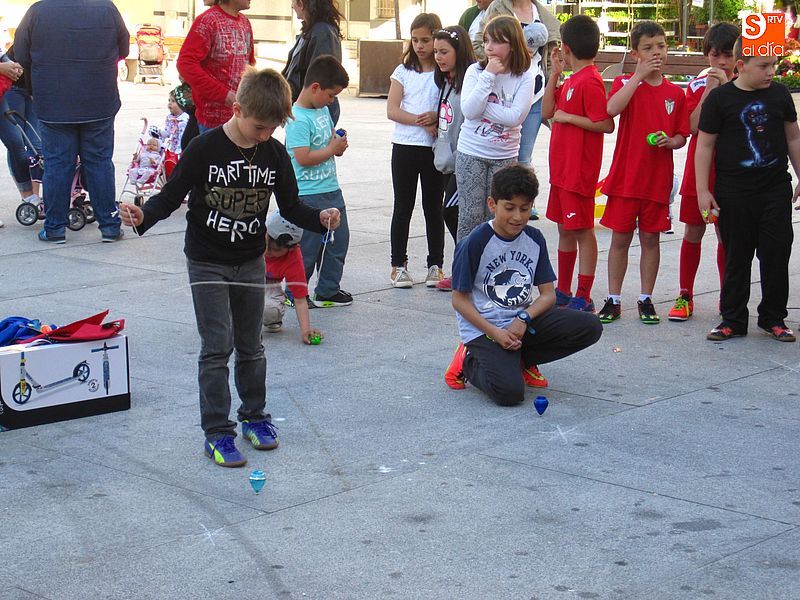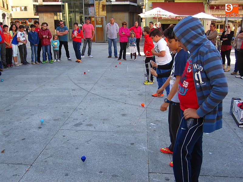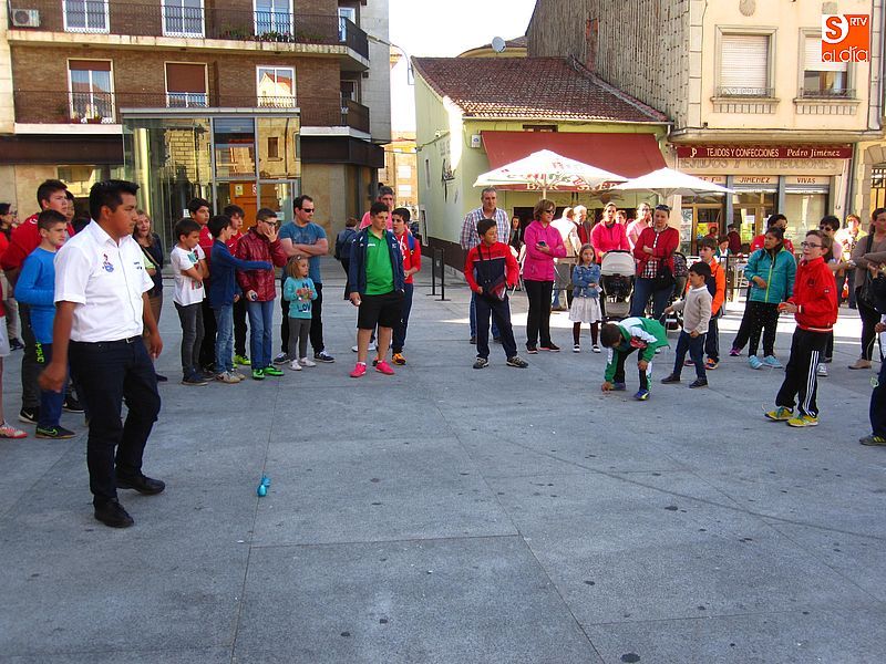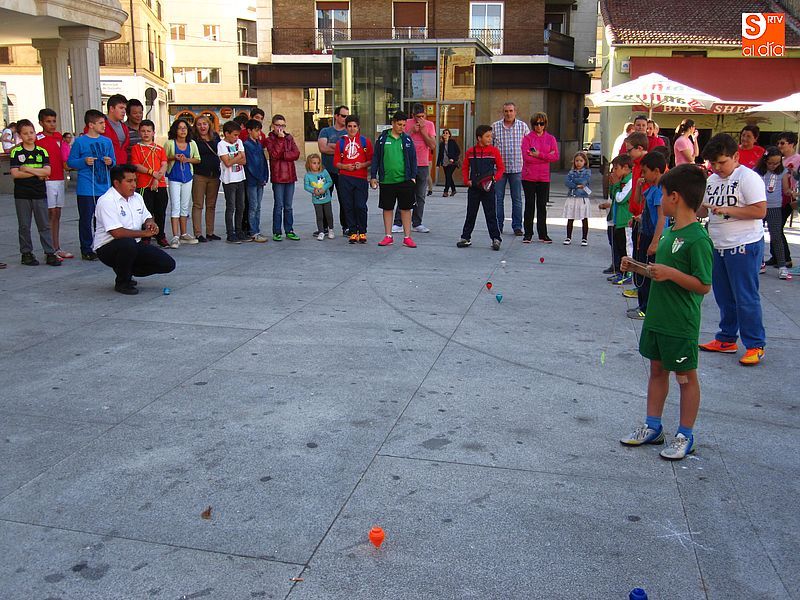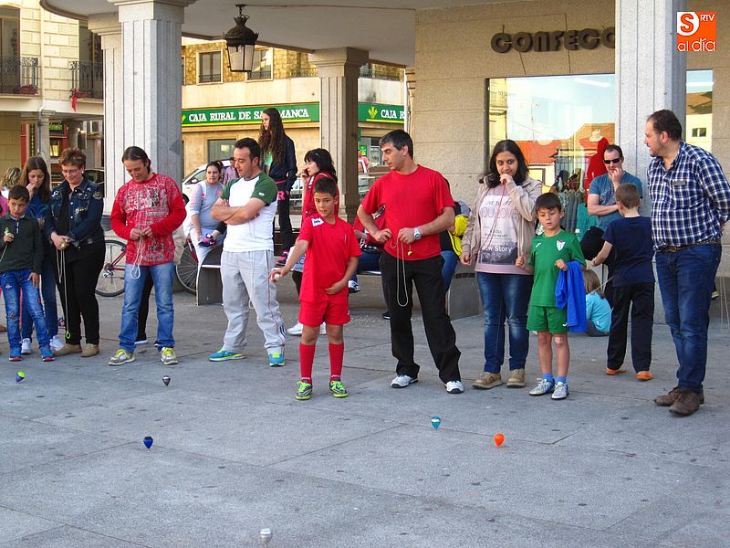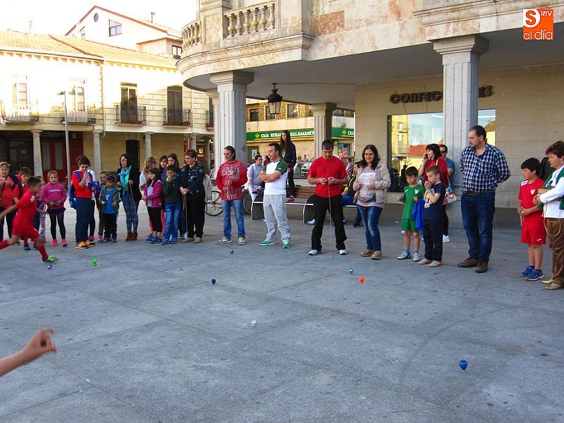 La pasión por la peonza tradicional se dejó ver una vez más en Guijuelo con la actividad propuesta por Alex Torres. El campeón del mundo procedente de México, ofreció una exhibición de habilidades con la peonza y organizó un pequeño torneo para todos los presentes. Cerca de un centenar de niños y adultos se interesaron por la actividad y compitieron entre ellos para ver quien hacía bailar mejor las peonzas.