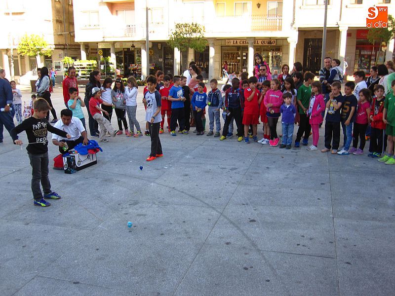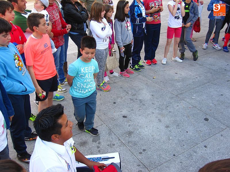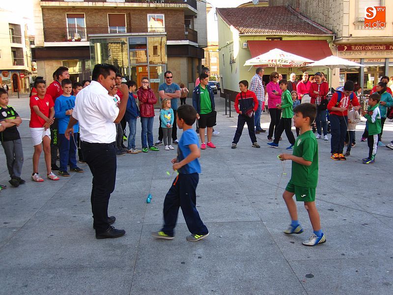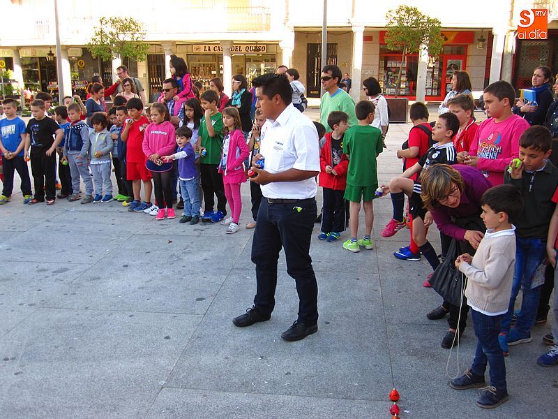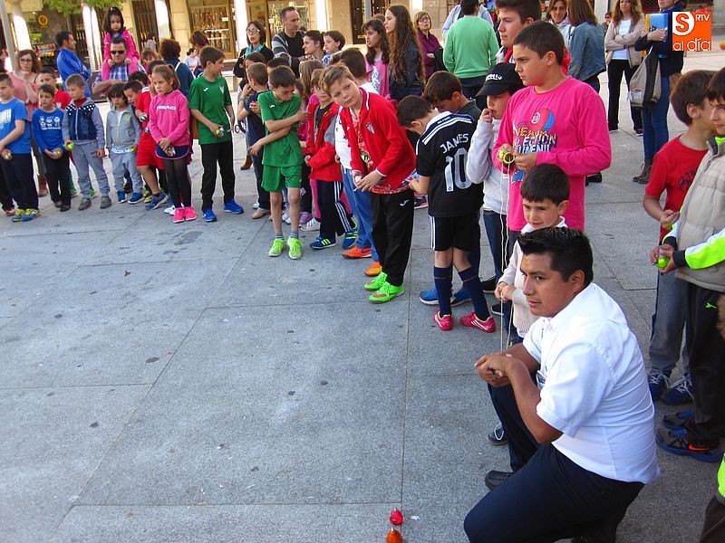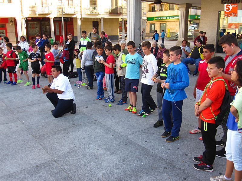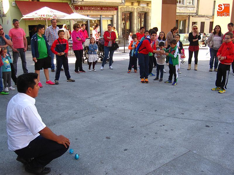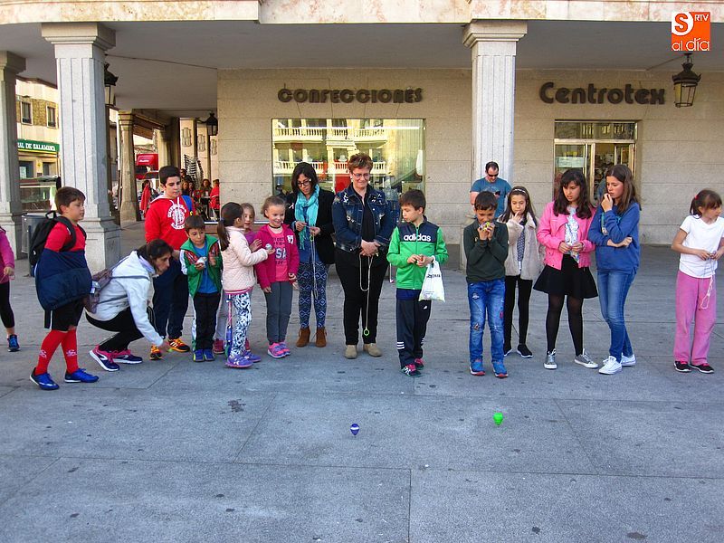La pasión por la peonza tradicional se dejó ver una vez más en Guijuelo con la actividad propuesta por Alex Torres. El campeón del mundo procedente de México, ofreció una exhibición de habilidades con la peonza y organizó un pequeño torneo para todos los presentes. Cerca de un centenar de niños y adultos se interesaron por la actividad y compitieron entre ellos para ver quien hacía bailar mejor las peonzas.