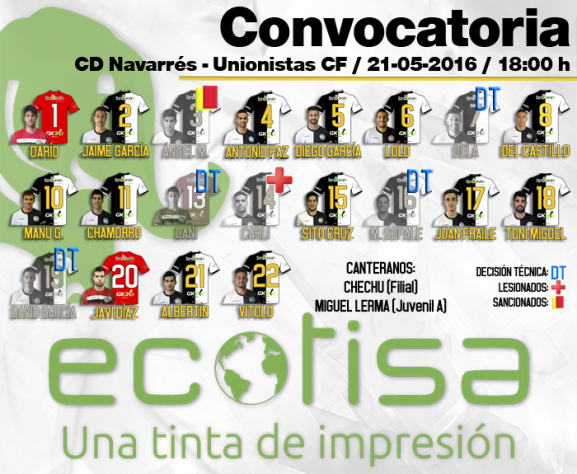 El entrenador de Unionistas de Salamanca CF, Jorge González Rojo 'Astu', ha dado la lista de convocados para el último partido de liga contra CD Navarrés. El compromiso, correspondiente a la jornada 34 de Primera Regional, se celebrará mañana sábado en Nava del Rey (Valladolid) a partir de las 18:00 horas. El club local ha establecido a 3 ? el precio de las entradas.