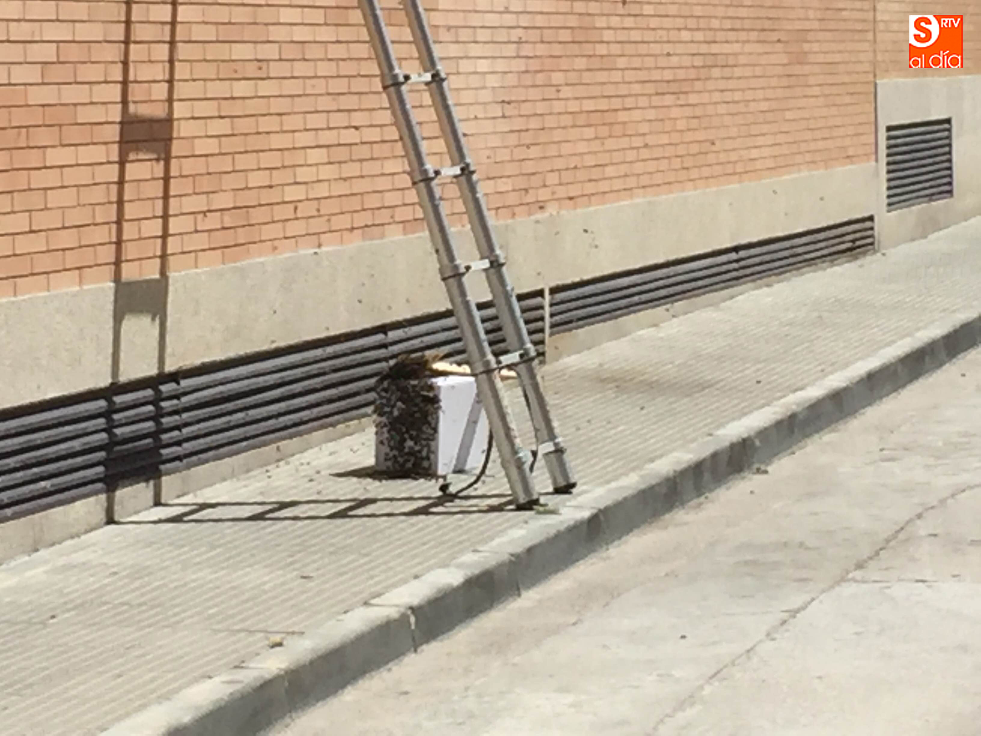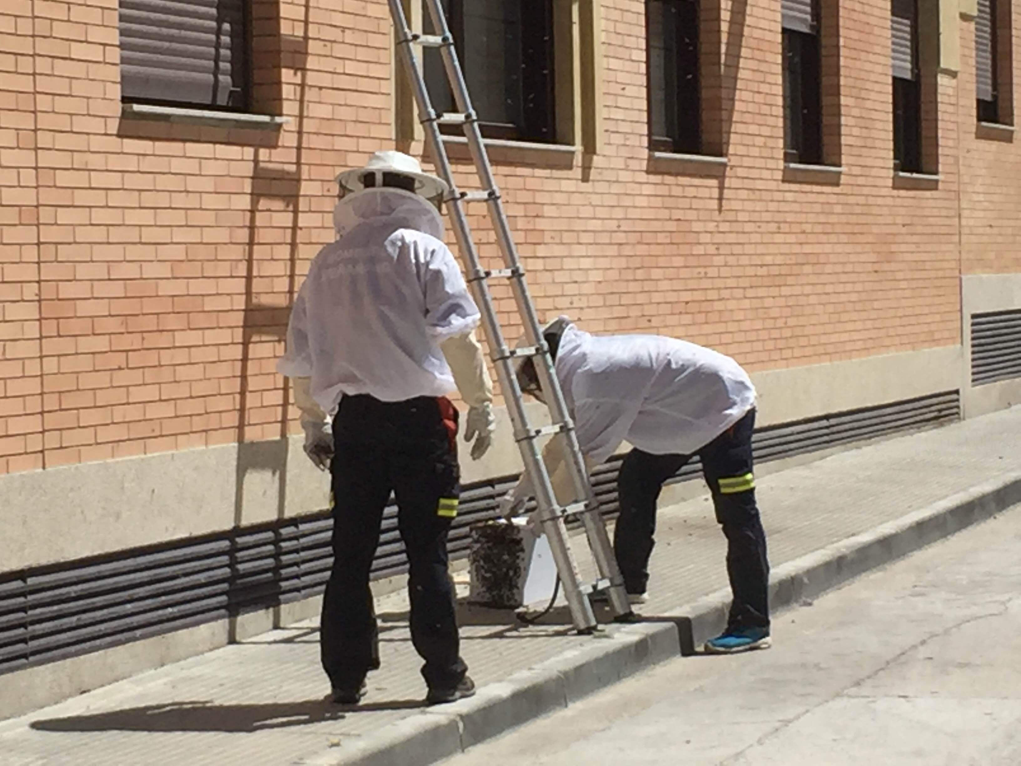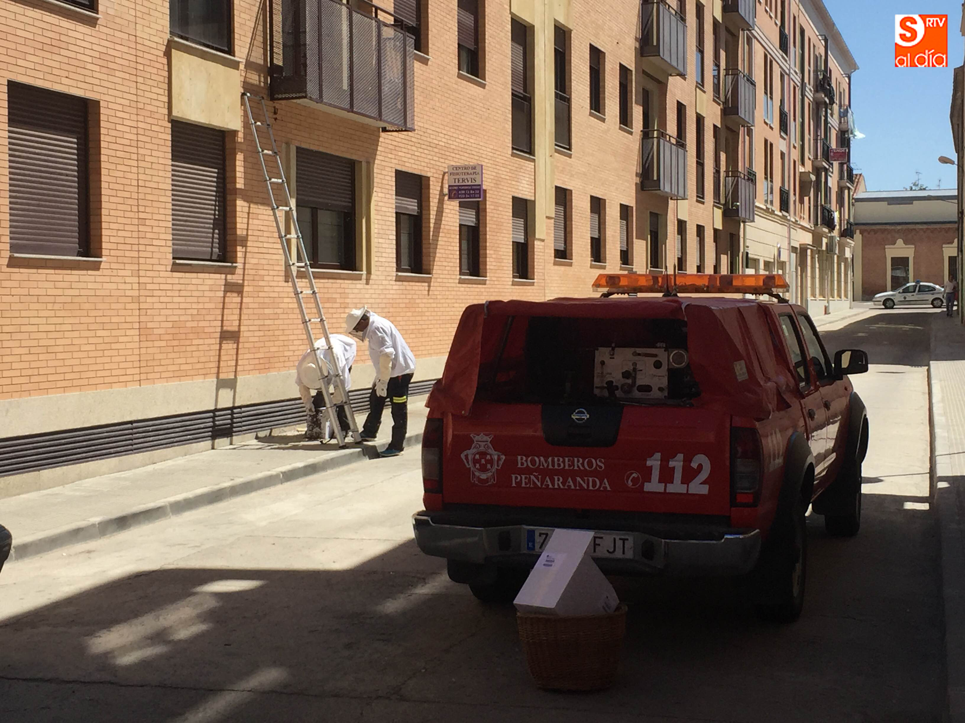 Los Bomberos de Peñaranda han vuelto a actuar de urgencia por segunda vez esta semana para retirar un enjambre de abejas ha anidado de manera repentina. Esta vez los insectos han aparecido a primeras horas de la mañana de este viernes bajo el balcón de un edificio en la calle el Payo.