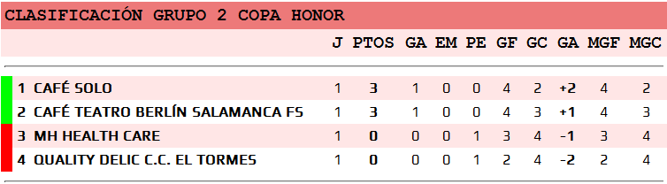 En el grupo 2 Café Solo, campeón de Liga, venció 4-2 a Quality CC El Tormes y Café Teatro Berlín 4-3 a MH Health Care