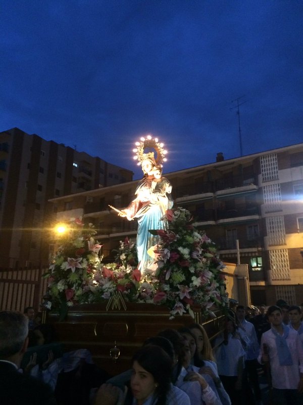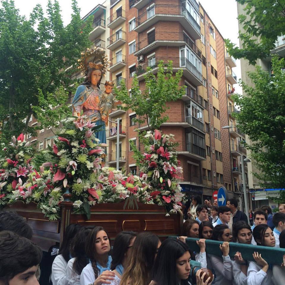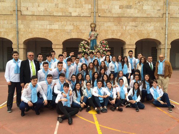 María Auxiliadora, que hoy vive su fiesta grande. Las andas de la Virgen fueron portadas por los alumnos de último curso y antiguos alumnos del colegio, procesionando también lo