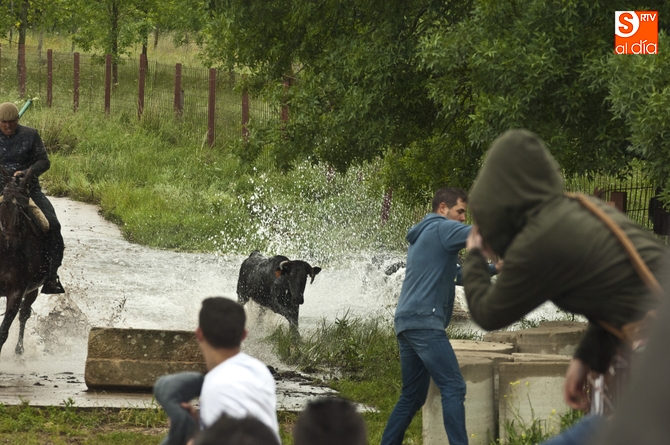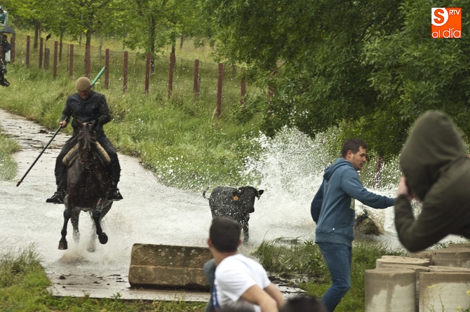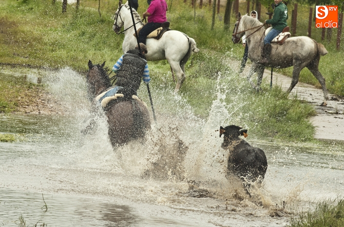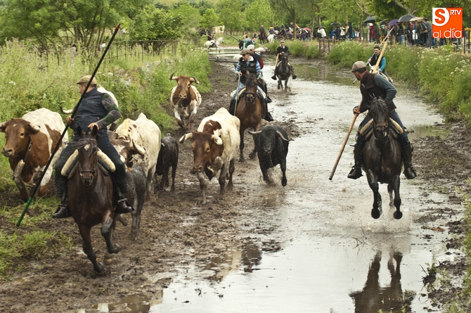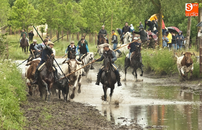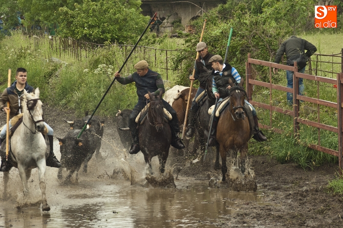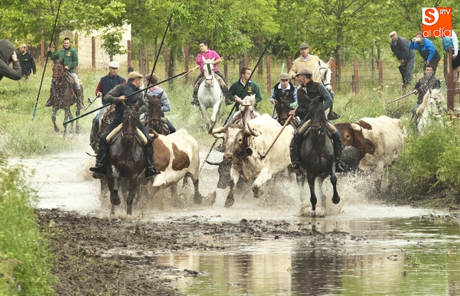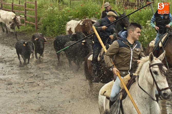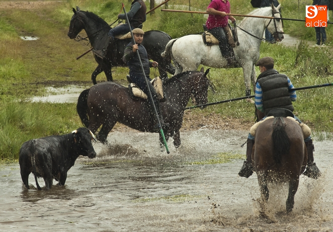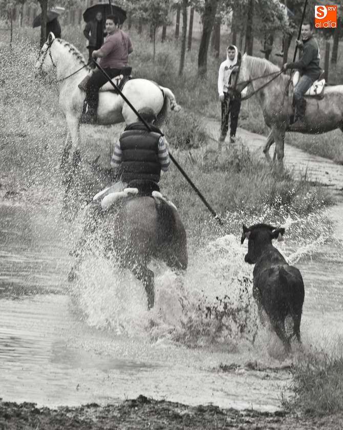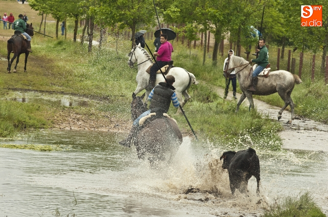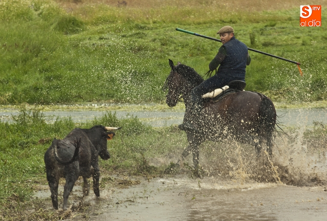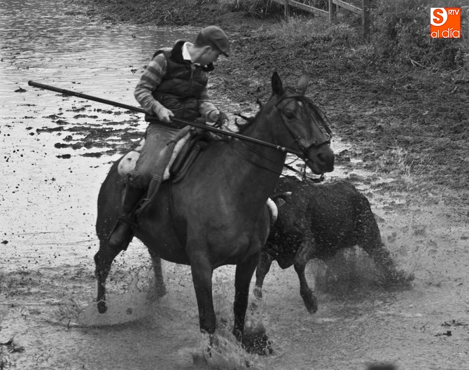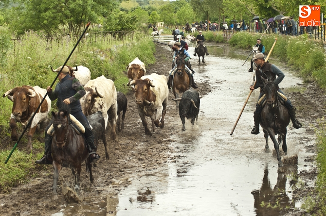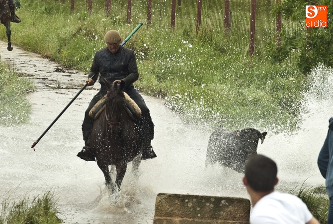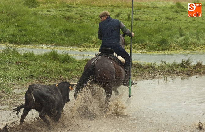 SANCTI-SPÍRITUS | La cantidad de agua en el recorrido debido a las intensas lluvias de la noche anterior acentuó el atractivo del encierro a caballo con ganado de Doña Mercedes Pérez-Tabernero y bueyes de Hermanos Sánchez Oviedo