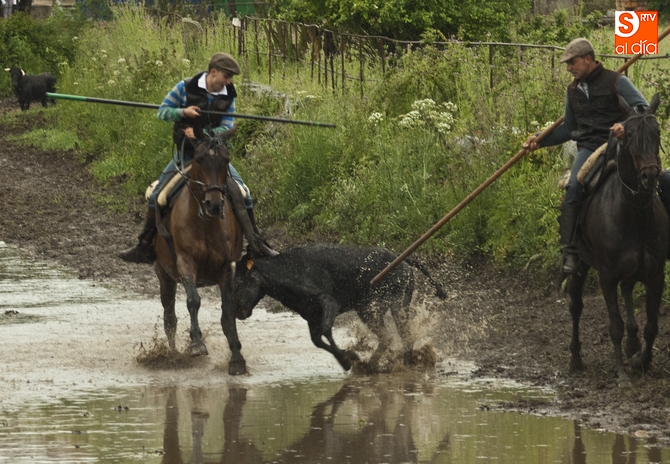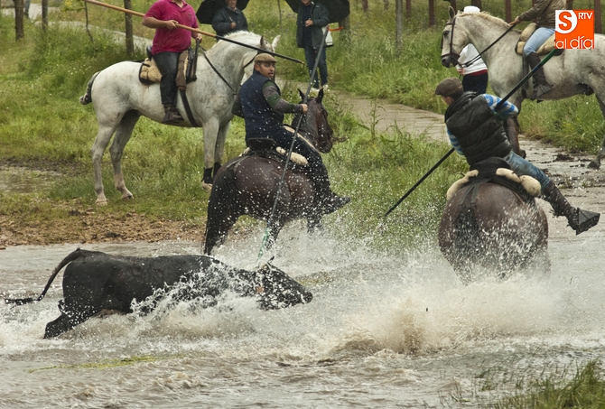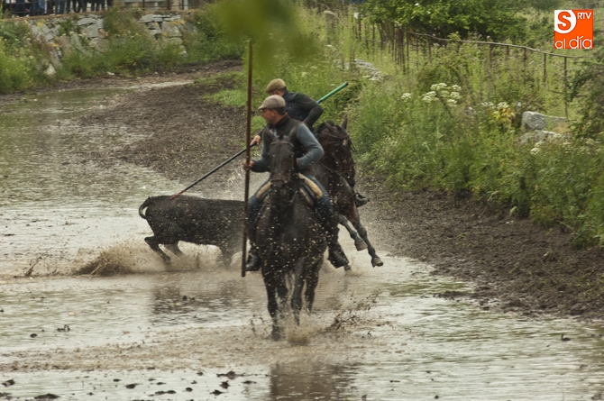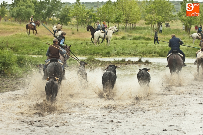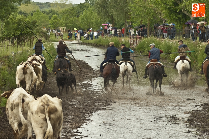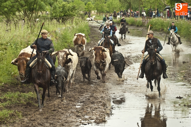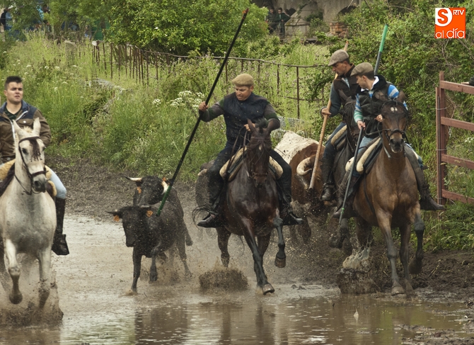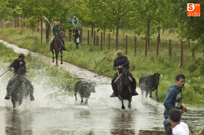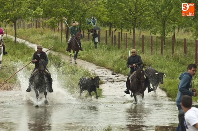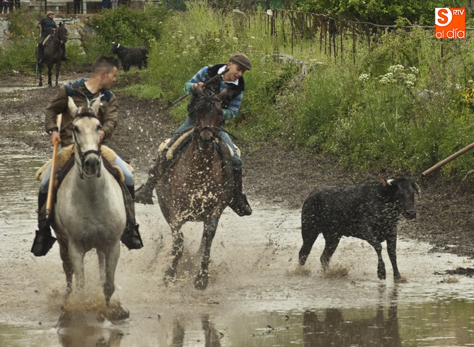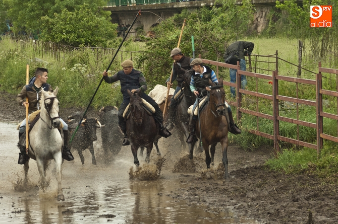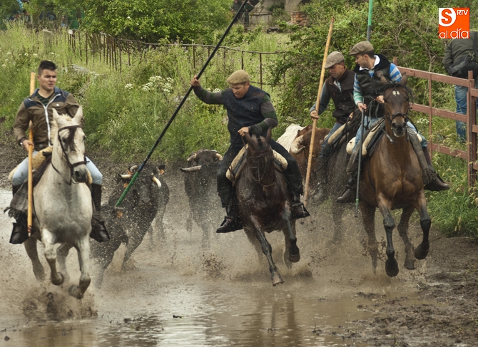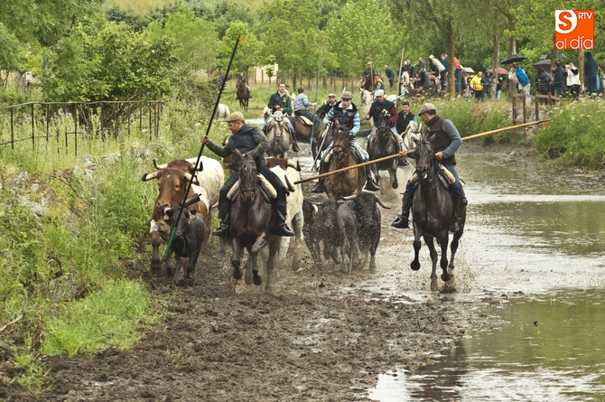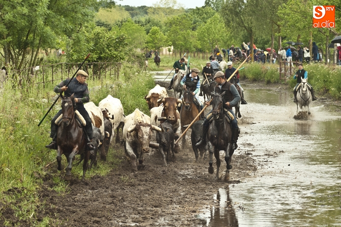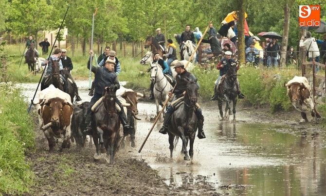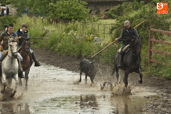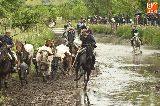 SANCTI-SPÍRITUS | La cantidad de agua en el recorrido debido a las intensas lluvias de la noche anterior acentuó el atractivo del encierro a caballo con ganado de Doña Mercedes Pérez-Tabernero y bueyes de Hermanos Sánchez Oviedo