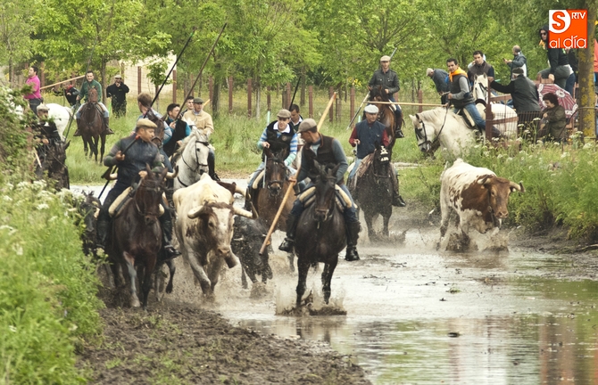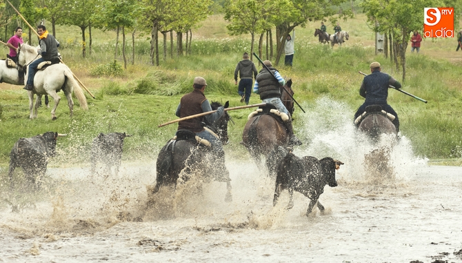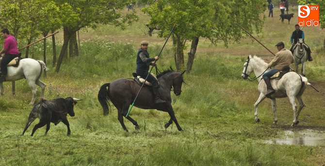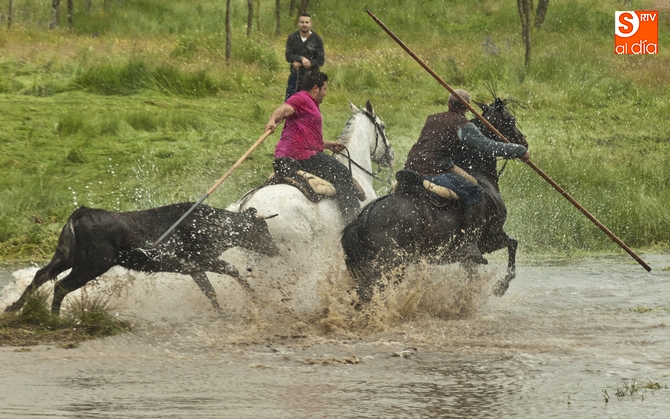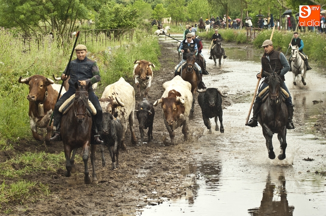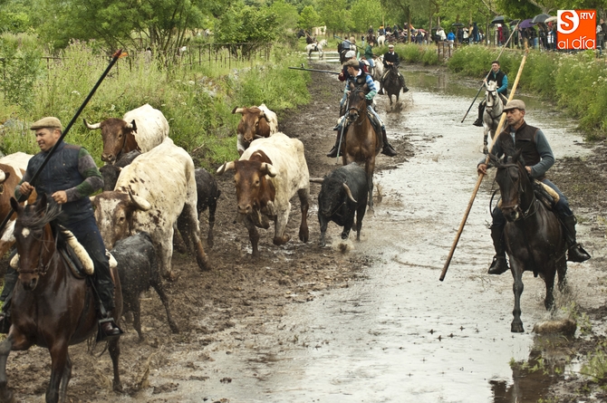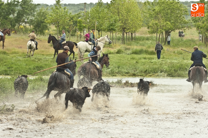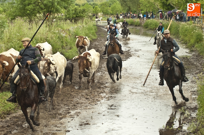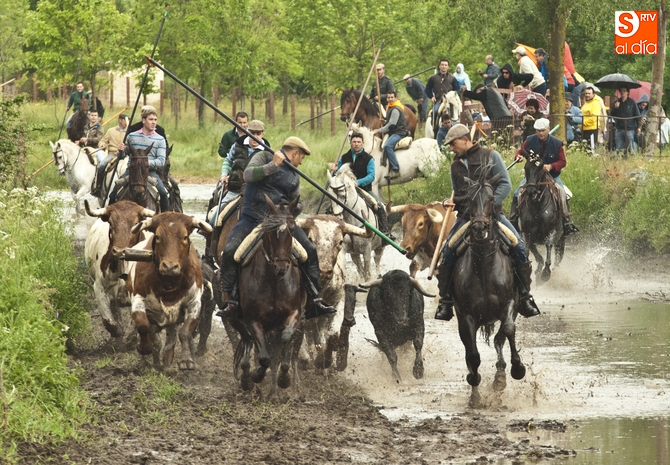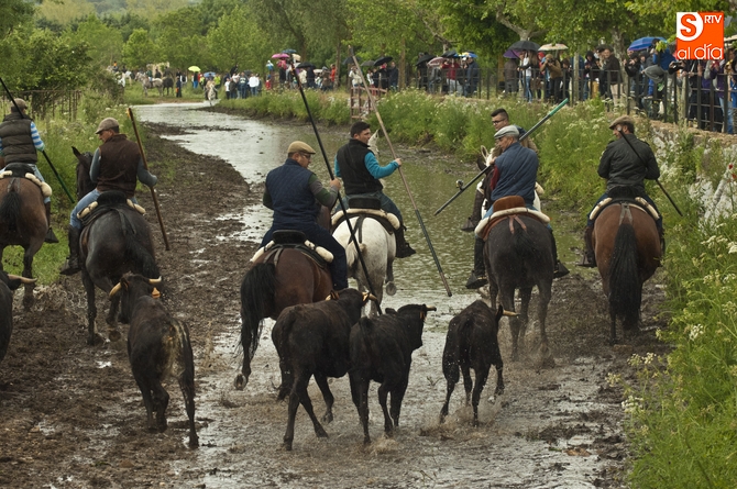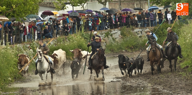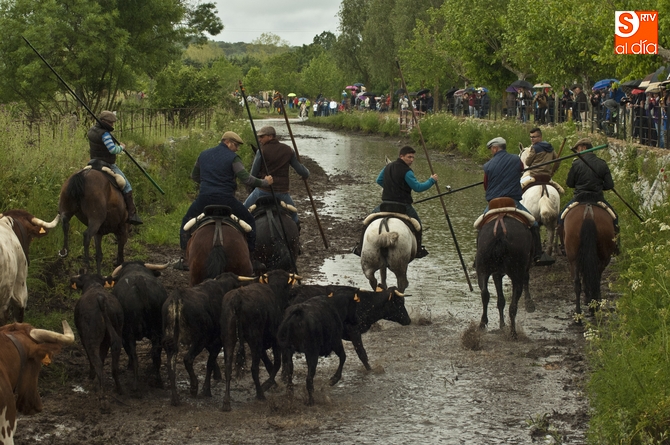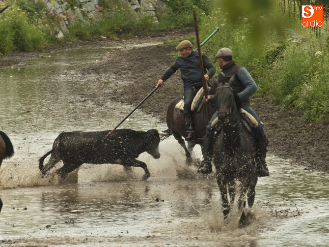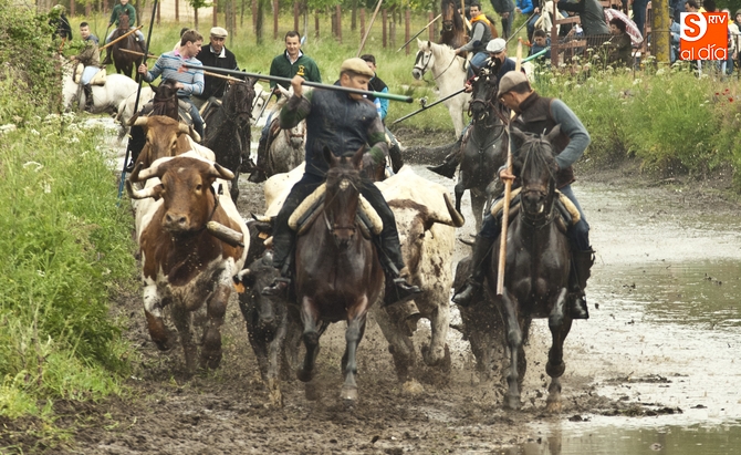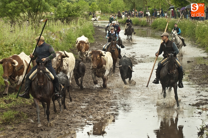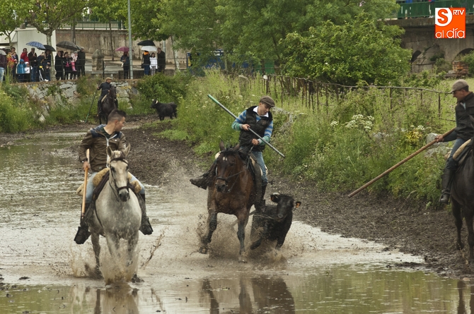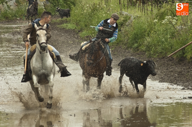 SANCTI-SPÍRITUS | La cantidad de agua en el recorrido debido a las intensas lluvias de la noche anterior acentuó el atractivo del encierro a caballo con ganado de Doña Mercedes Pérez-Tabernero y bueyes de Hermanos Sánchez Oviedo