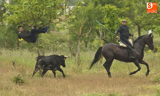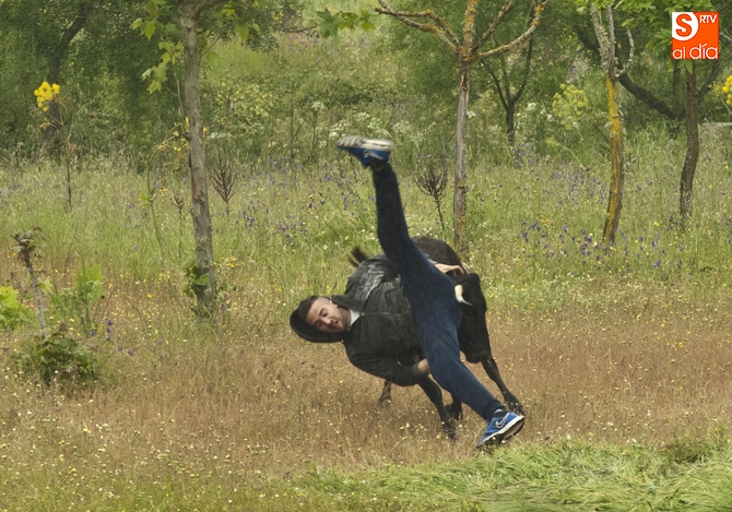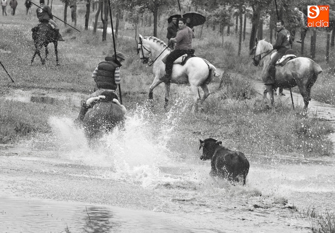 Dos de las reses de Doña Mercedes quedaron rezagadas en el recorrido hacia la plaza, lo que hizo prolongar más tiempo el encierro de campo en el que caballistas y aficionados disfrutaron de lo lindo llegando a producirse algún revolcón al elegir un corredor una rama de árbol demasiado pequeña para su peso, quedando todo en un susto.Encierro a caballo pasado por agua  | Imagen 1