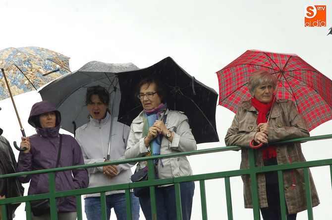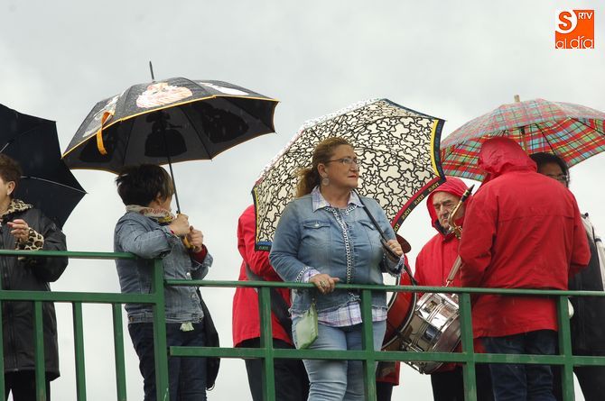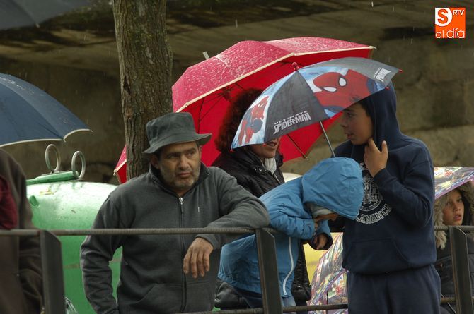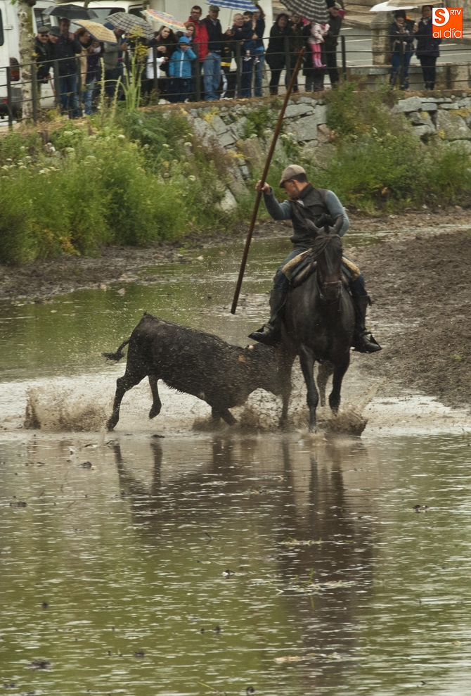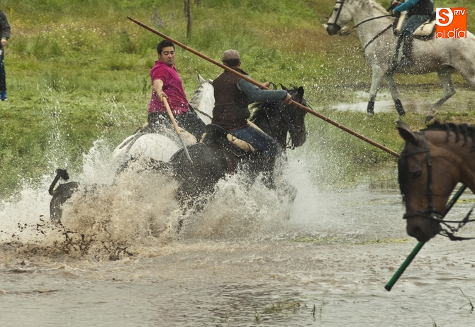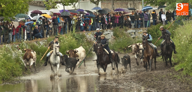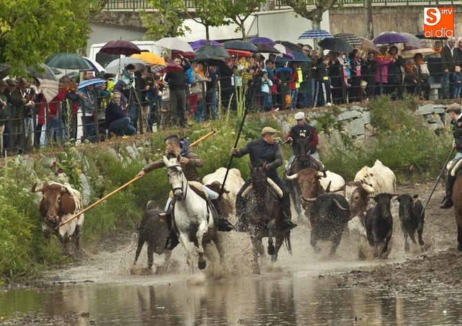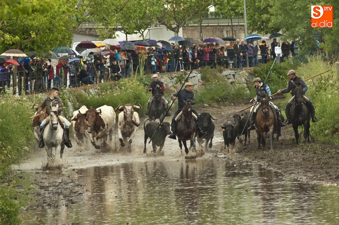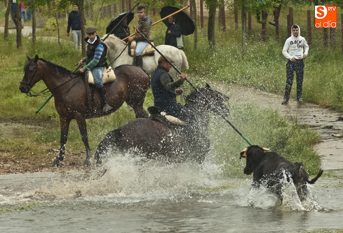 En la mañana del domingo será turno para la parte más solemne de las fiestas, con la misa (cantada por Santarém Folk) y la procesión del Corpus. Por la tarde, a las 19.00 horas, habrá un festival mixto con 2 novillos de Carreros (de Sancti-Spíritus) para el matador Álvaro de la Calle; otros 2 para la rejoneadora Ana Rita; y un quinto novillo para el alumno de la Escuela de Tauromaquia de Salamanca, Manuel de Diosleguarde. El día concluirá con la actuación de María José la Cordobesa.Encierro a caballo pasado por agua  | Imagen 2