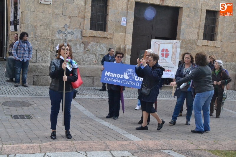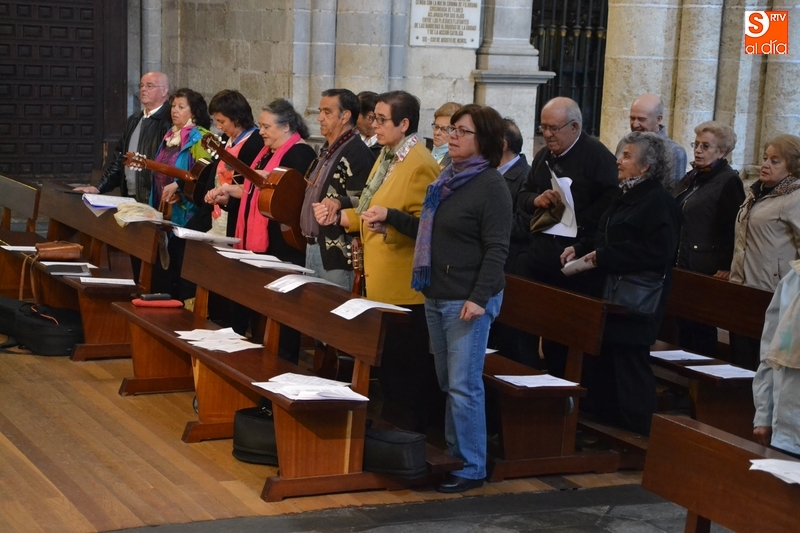 A continuación, comenzó la breve peregrinación hasta la Catedral, en la que se lucieron carteles de Manos Unidas y Cáritas Diocesana, y que despertó la sorpresa de los turistas que en ese momento estaban por la Plazuela de Herrasti. A la hora de entrar en la Catedral, se accedió como en todos los Jubileos por el Pórtico del Perdón. Una vez dentro, hubo una Eucaristía.