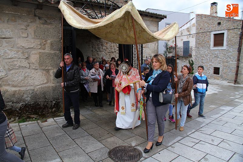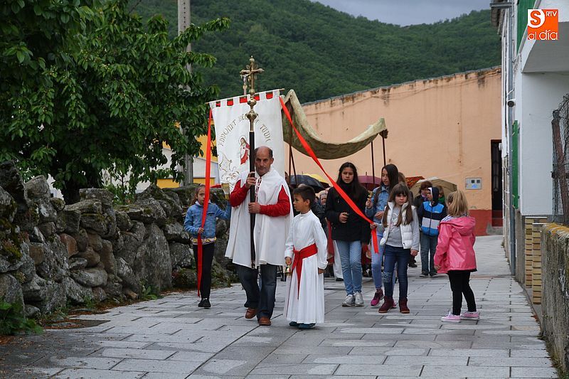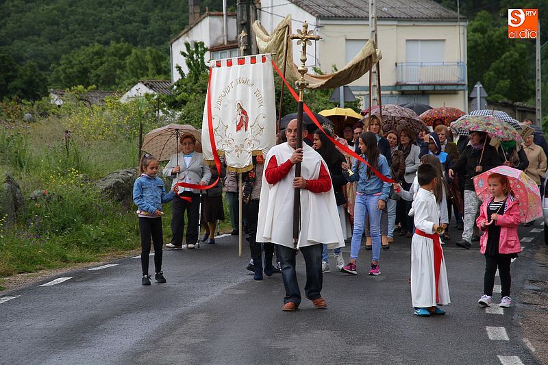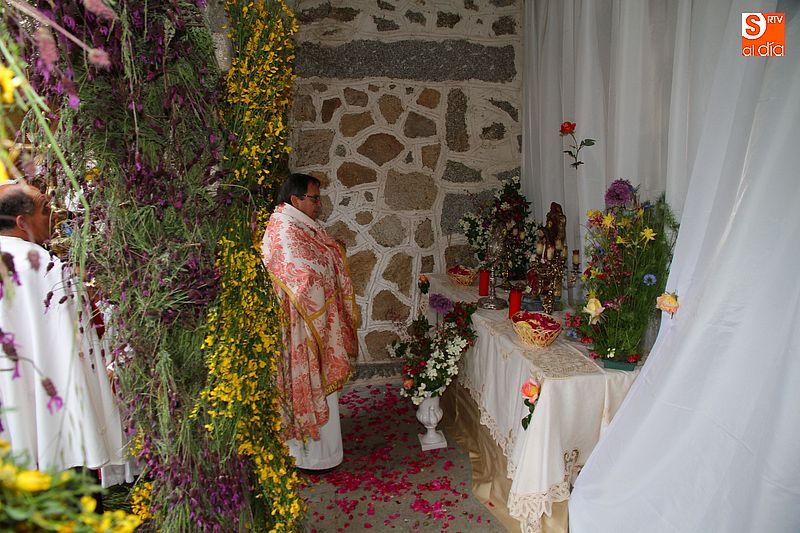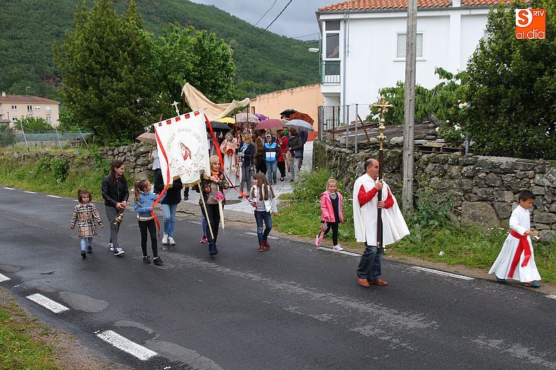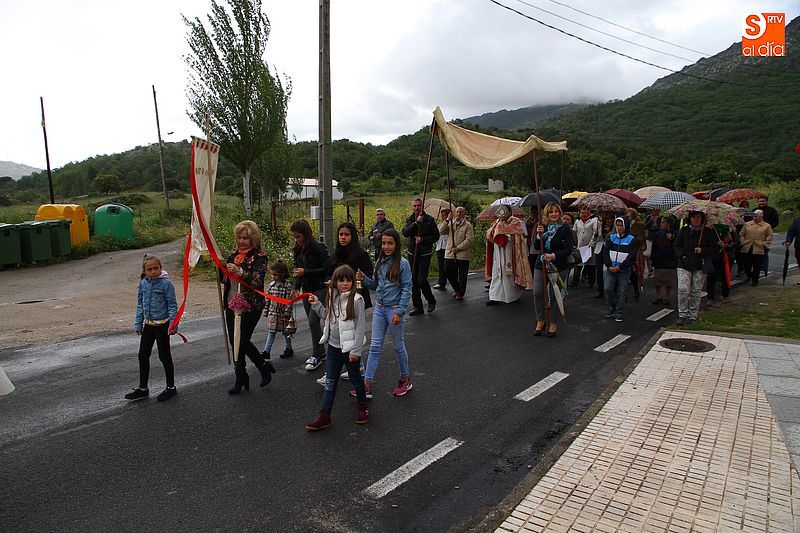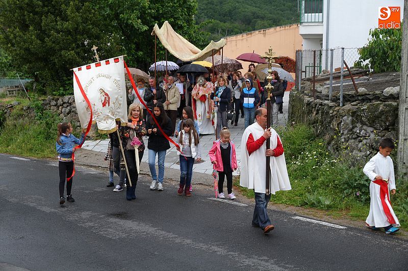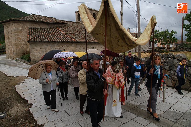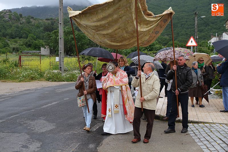 La programación religiosa de Sanchotello se celebró en la tarde de hoy, con la tradicional misa y posterior procesión. Tras el oficio religioso, la comitiva partió desde el templo hacia la plaza Mayor. En los soportales del consultorio médico se instaló el altar para evitar la amenazante lluvia. El tiempo respetó los primeros minutos del acto religioso, pero una vez visitado el altar, comenzó un fuerte aguacero que obligó a acelerar el acto. Tras visitar un segundo altar, los presentes devolvieron la efigie del Cuerpo de Cristo a la iglesia, protegido por el palio y numerosos paraguas.