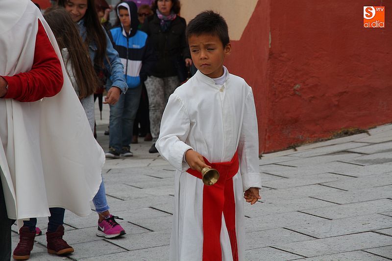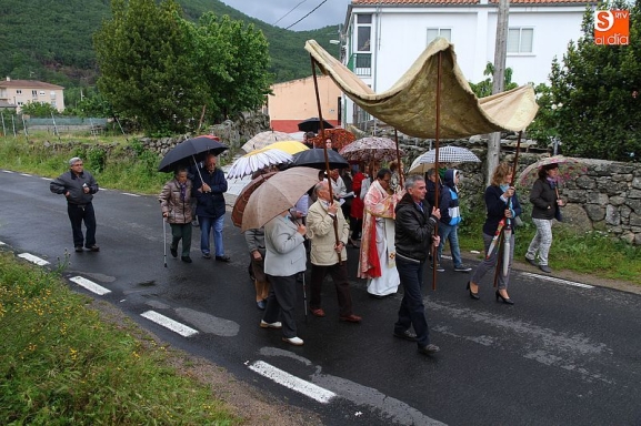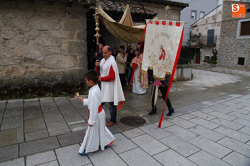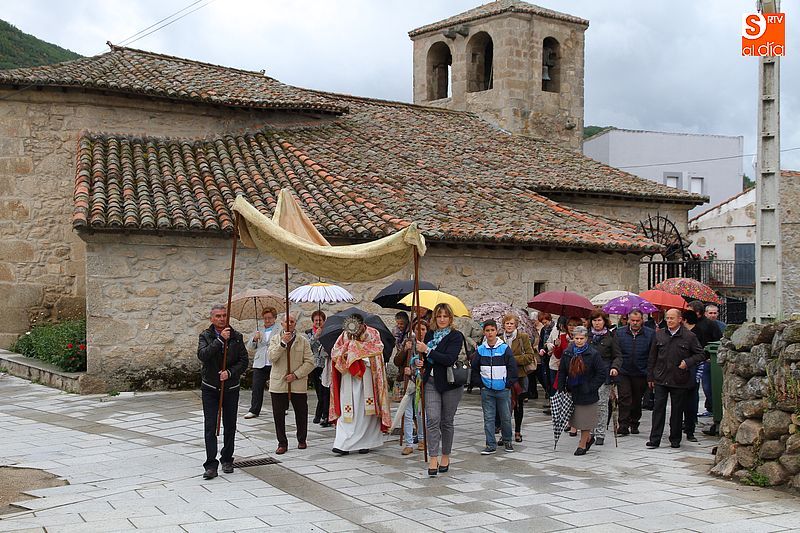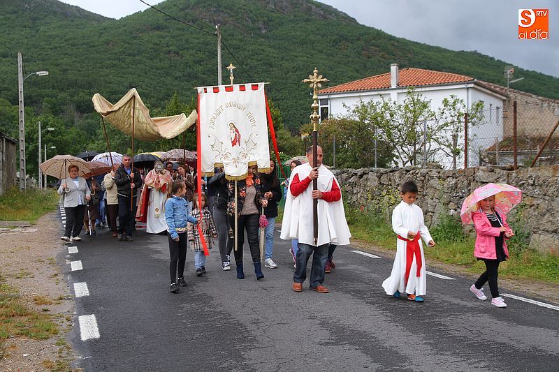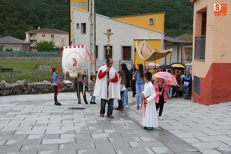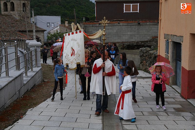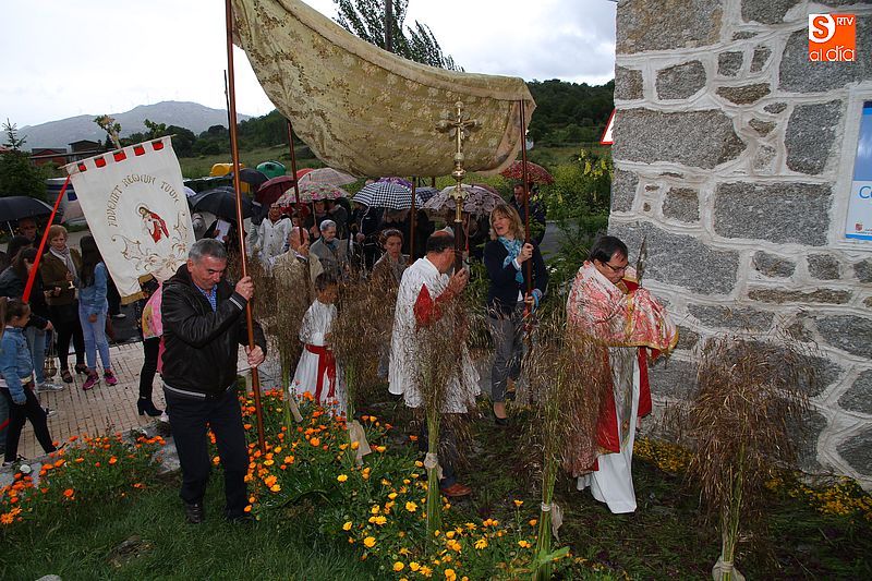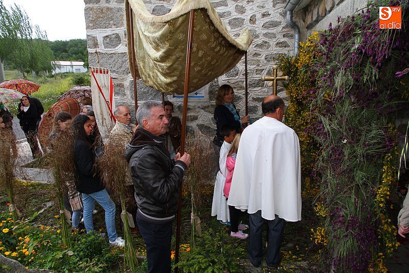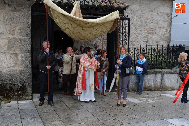 La programación religiosa de Sanchotello se celebró en la tarde de hoy, con la tradicional misa y posterior procesión. Tras el oficio religioso, la comitiva partió desde el templo hacia la plaza Mayor. En los soportales del consultorio médico se instaló el altar para evitar la amenazante lluvia. El tiempo respetó los primeros minutos del acto religioso, pero una vez visitado el altar, comenzó un fuerte aguacero que obligó a acelerar el acto. Tras visitar un segundo altar, los presentes devolvieron la efigie del Cuerpo de Cristo a la iglesia, protegido por el palio y numerosos paraguas.