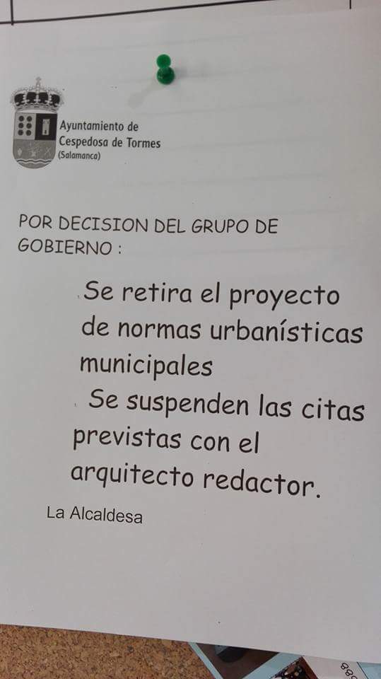 El Ayuntamiento de Cespedosa anunció ayer que no continuará con el proyecto de las nuevas normas urbanísticas. Tras la reunión mantenida el sábado por la tarde en el salón municipal, la alcaldesa, Filoisa Hernández, señaló que si la voluntad popular era contraria a las normas, estas se retirarían. Al día siguiente, el Consistorio anunció mediante un cartel la retirada del proyecto y la suspensión de las citas previstas con el arquitecto redactor.