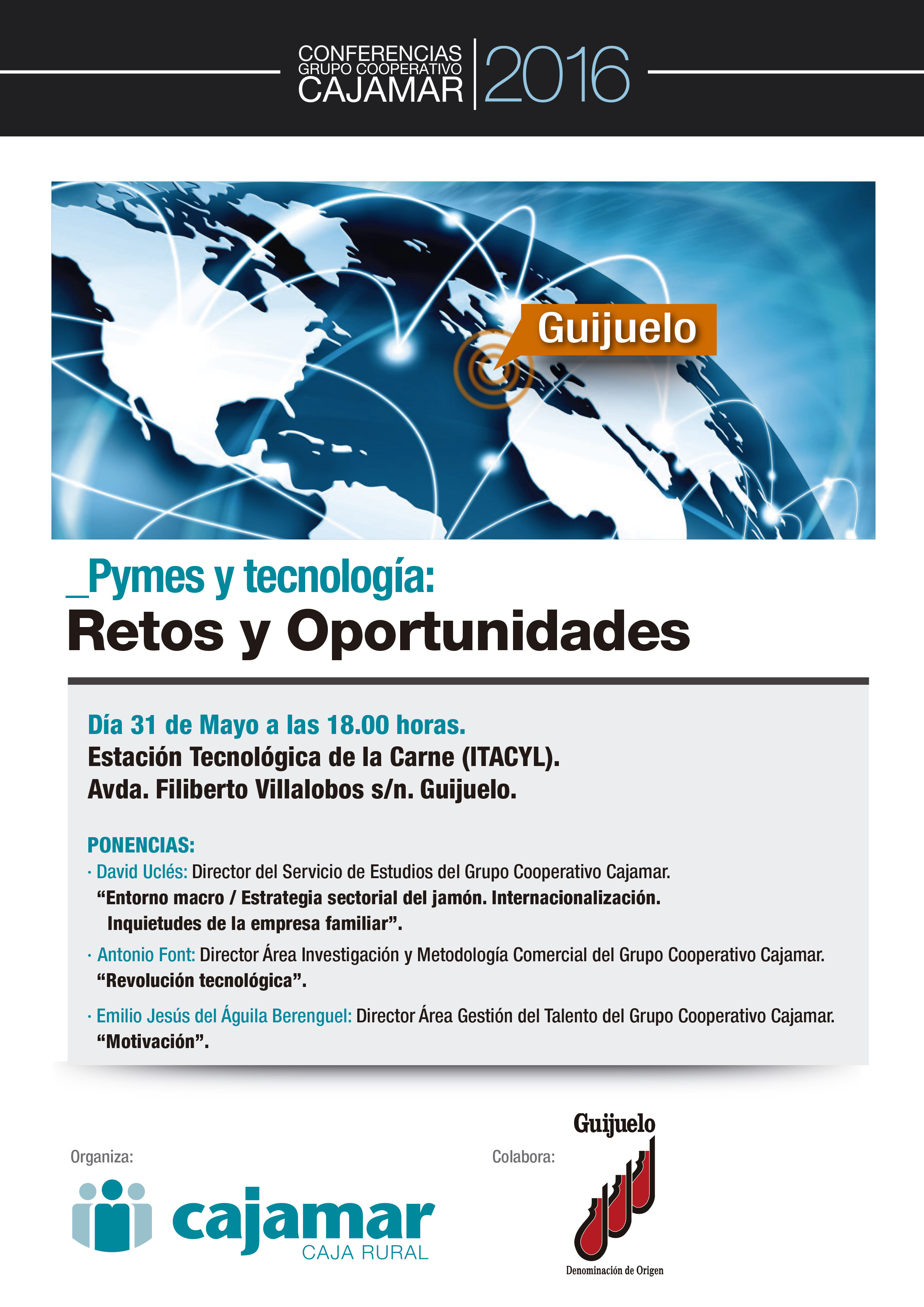 La Estación Tecnológica de la Carne acoge esta tarde la jornada "Pymes y tecnología: retos y oportunidades". Este encuentro, organizado por Cajamar Caja Rural y la Denominación de Origen Protegida Guijuelo, está dirigido a pequeñas y medianas empresas y autónomos de la provincia, se celebrará a partir de las 18:00 horas.