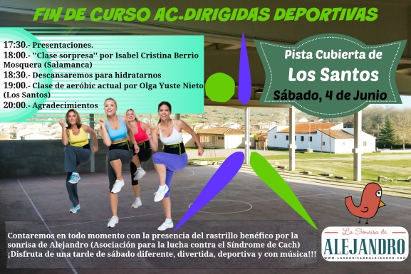 El final de curso de los grupos de aeróbic se vivirá de manera especial este sábado en Los Santos. Se ha organizado una jornada a la que están invitadas todas las alumnas y está abierto a toda persona que quiera participar. Tendrá lugar en la pista cubierta, en las inmediaciones de la plaza de toros, donde también se instalará un rastrillo benéfico a favor de la asociación La Sonrisa de Alejandro, a favor de la investigación contra el Síndrome de CACH. Las actividades comenzarán a las 17:30 horas y se contará con dos clases especiales de aeróbic, la primera de ellas impartida por Isabel Berrio y la segunda por Olga Yuste.