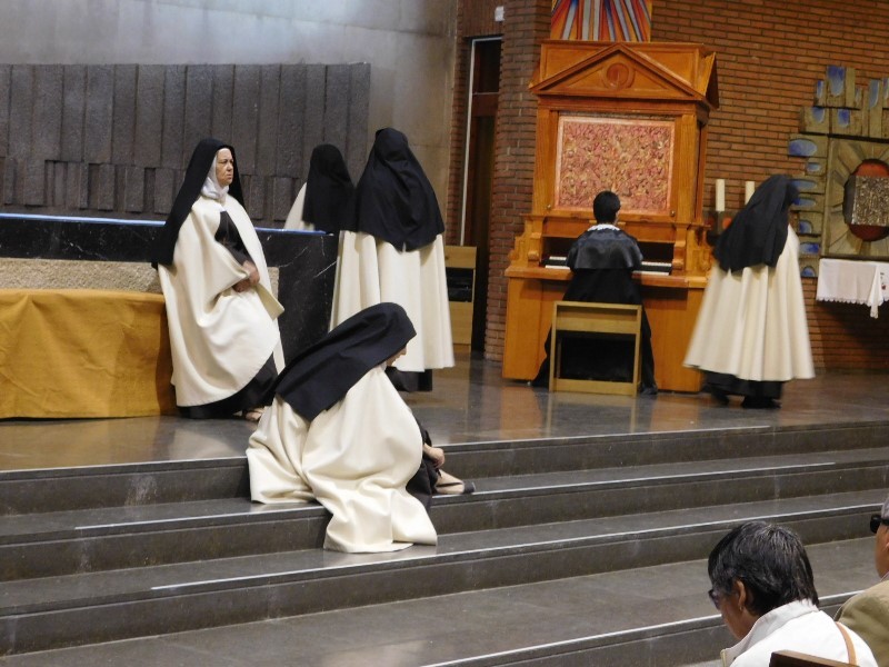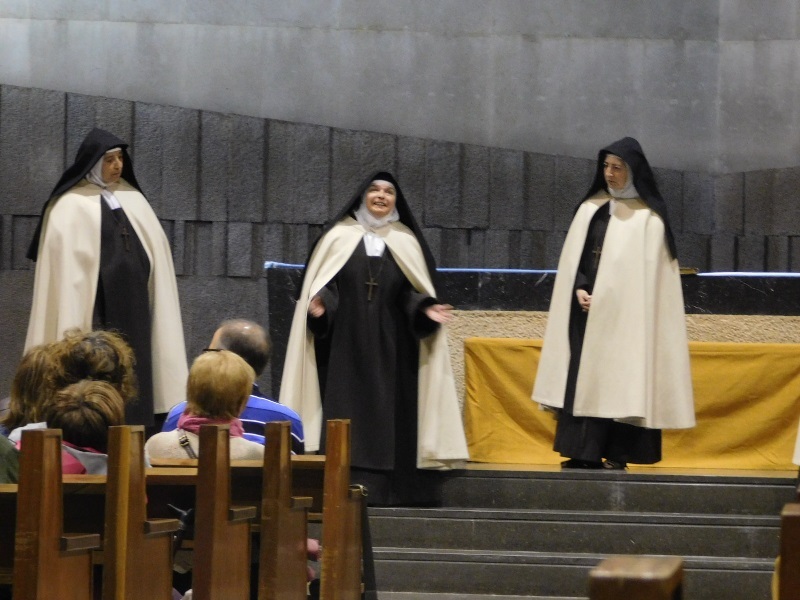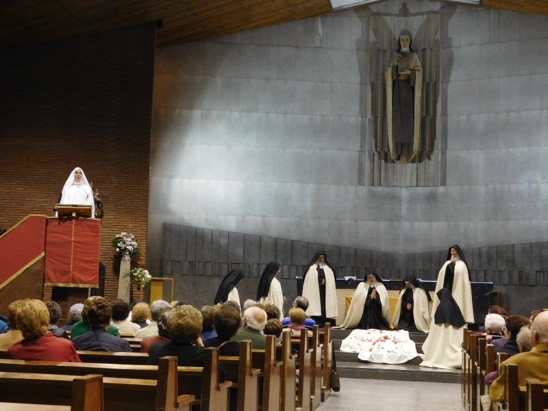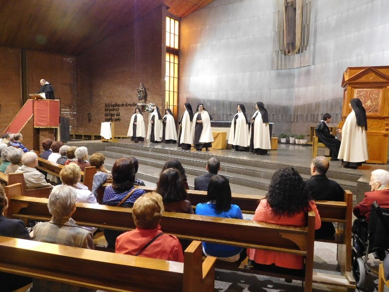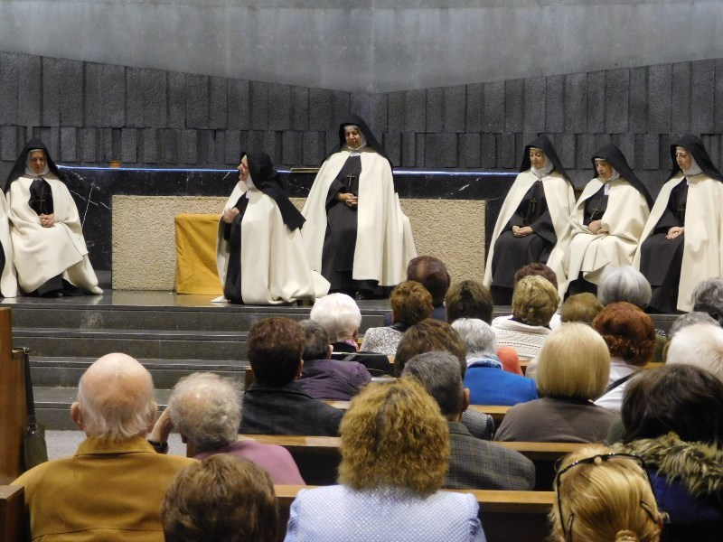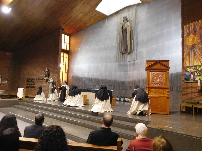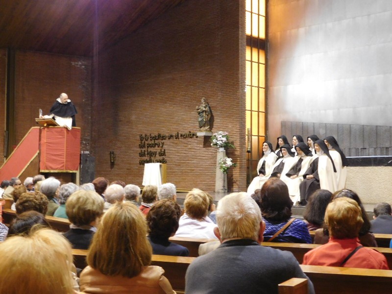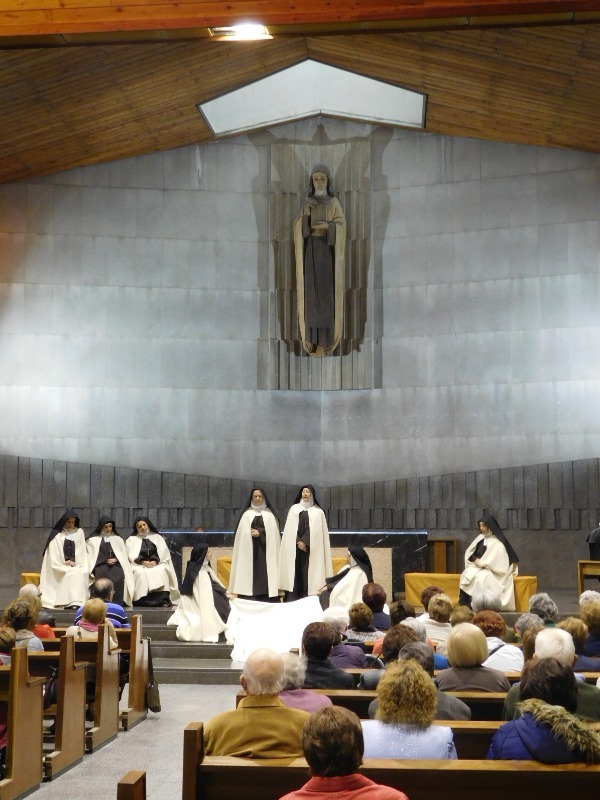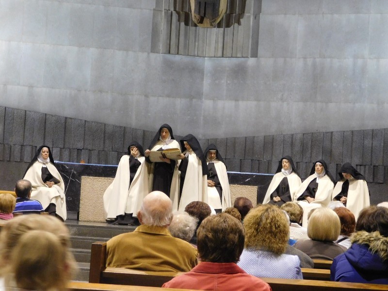 La iglesia de Santa Teresa de Valladolid, ubicada en el barrio de La Rondilla, donde todo se relaciona con la carmelita del XVI, los recibió en esta tarde del sábado 28 de mayo, para asistir a su 120 representación. Está curiosamente situada en la calle de Tomás de Torquemada, conocido y emblemático inquisidor de la época, que gustoso hubiera llevado a la hoguera a Teresa con todos sus pecados: ser mujer, inteligente, de alta formación intelectual y teológica, escritora, reivindicativa para con los marginados, y ¡ohm, Señor!, una monja enamorada del Hijo de Dios, un Jesús que lo dio todo por amor a nosotros.