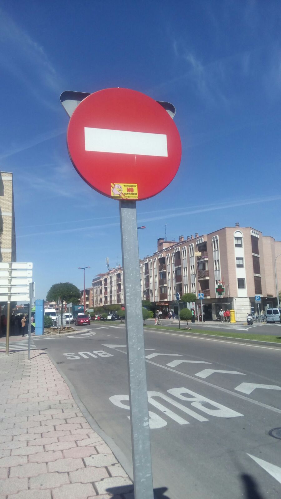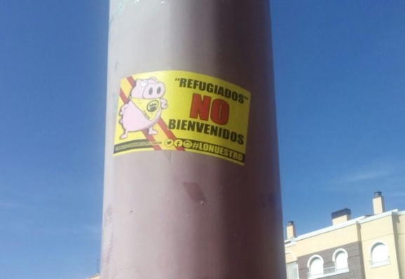 "EXPONGO: Que conforme a lo previsto en la Ordenanza Municipal sobre Protección de la Convivencia Ciudadana y Prevención de Actuaciones Antisociales que rigen en nuestro municipio se ha detectado una infracción grave de la misma al incurrir de una forma reiterada, según su Art. 21/ a), en la colocación de adhesivos en farola, señales y otros bienes públicos con el mensaje "Refugiados no bienvenidos", contraviniendo el Art. 7/.1 de esta Ordenanza. Adjuntamos en anexo fotografía del adhesivo en el que figuran también enlaces de Twitter y Facebook de los infractores.