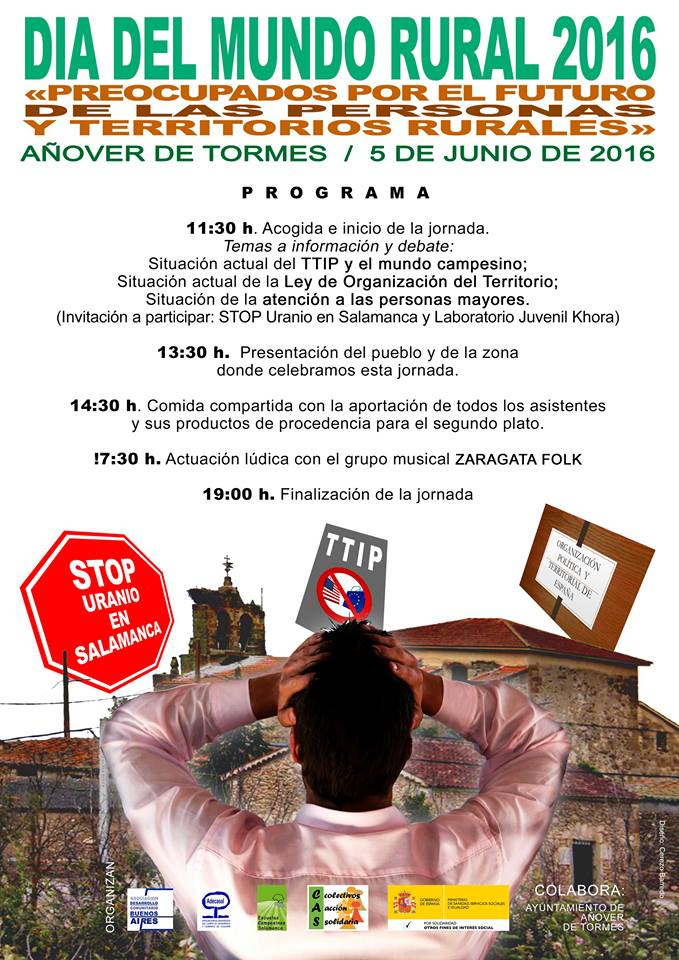 Añover de Tormes será escenario este domingo día 5 de la celebración del Día del Mundo Rural, bajo el lema Preocupados por el futuro de las personas y territorios rurales, una jornada de reflexión, reivindicación y fiesta que organiza cada año conjuntamente las asociaciones Escuelas Campesinas de Salamanca, Adecasal y Asdecoba, y cuyo objetivo es visibilizar su lucha y trabajo por hacer posible un mundo rural vivo. Una jornada en la que se debatirá sobre la situación actual del TTIP y el mundo campesino, la atención a las personas mayores y la situación de la Ley de Ordenación del Territorio.