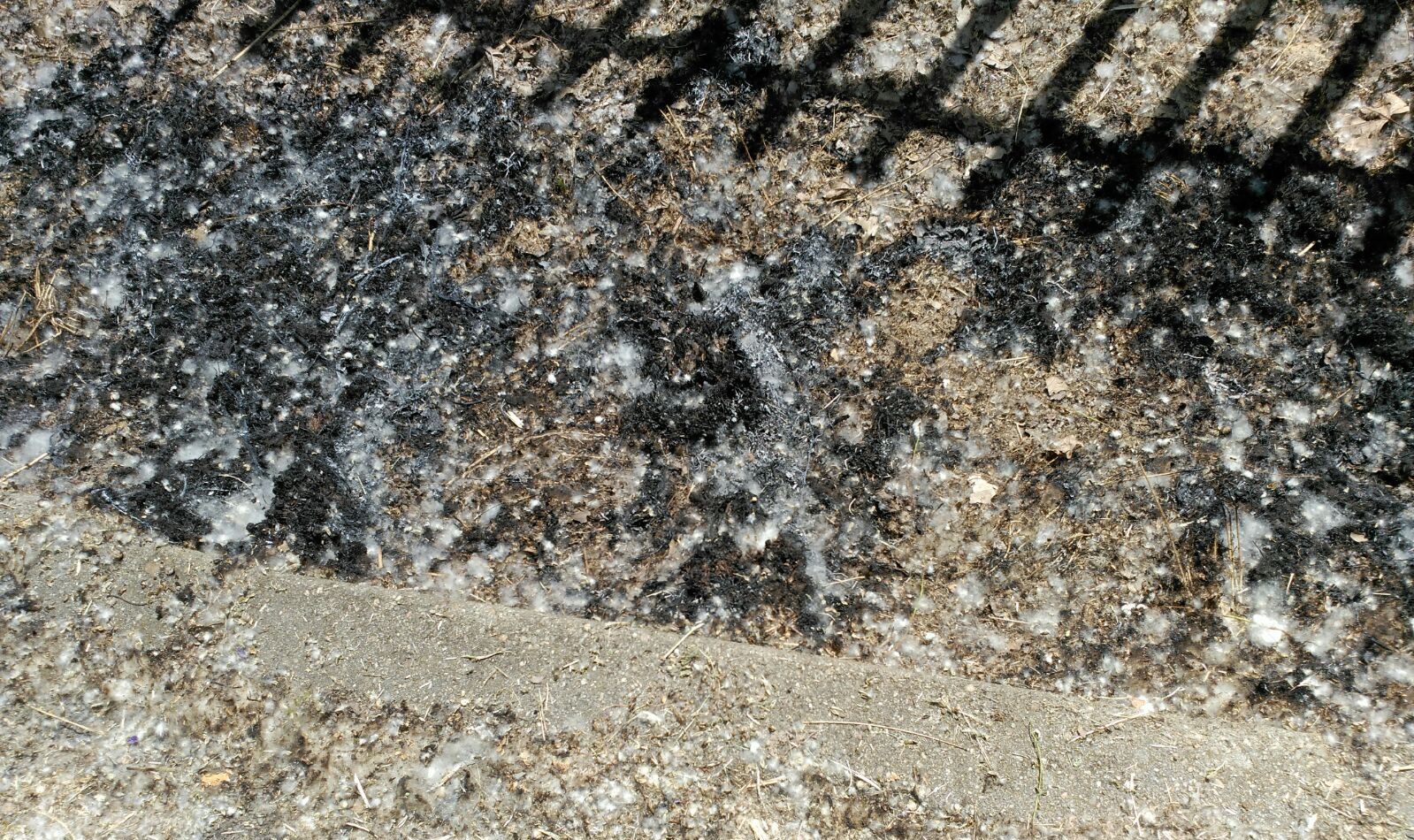 Por ejemplo, las imágenes que ilustran esta información pertenecen a la cuneta de la calzada de la parte trasera del Colegio Arrabal del Puente y al Parque del Regato Cachón, donde se han quemado pelusas a plena luz del día.
