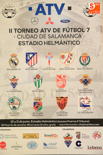 Este fin de semana los aficionados al fútbol de Salamanca y de toda España tienen una cita ineludible con el II Torneo Nacional ATV Fútbol 7 Ciudad de Salamanca, una competición que reunirá a los mejores equipos de España en categoría alevín (Real Madrid, Atlético de Madrid ?vigente campeón-, Rayo Vallecano, Celta de Vigo, Real Valladolid, CD Guijuelo y CF Salmantino) y de la provincia (Hergar Camelot, Villares de la Reina, Navega, San Agustín, Sporting de Carbajosa y Peñaranda, que disputarán la primera fase, cuyo campeón pasa a la fase final con los equipos antes citados).